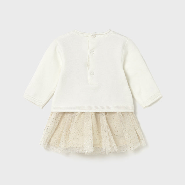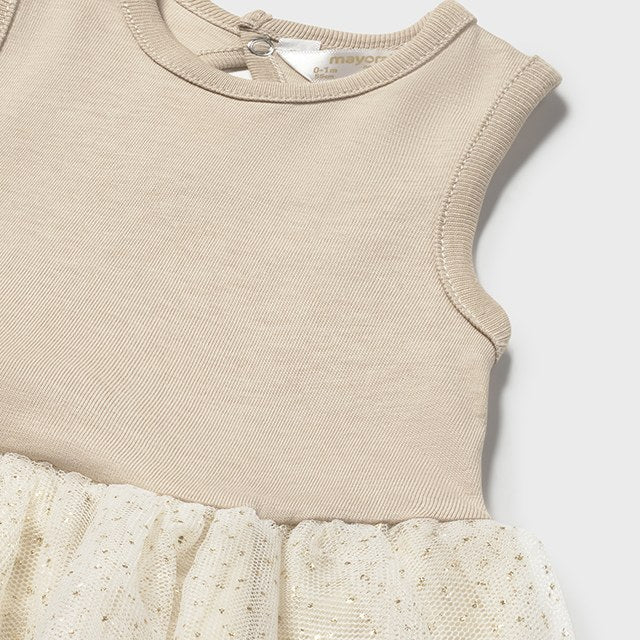 Baby Girl Cream Cotton Dress with Tulle Skirt & Bow Detail