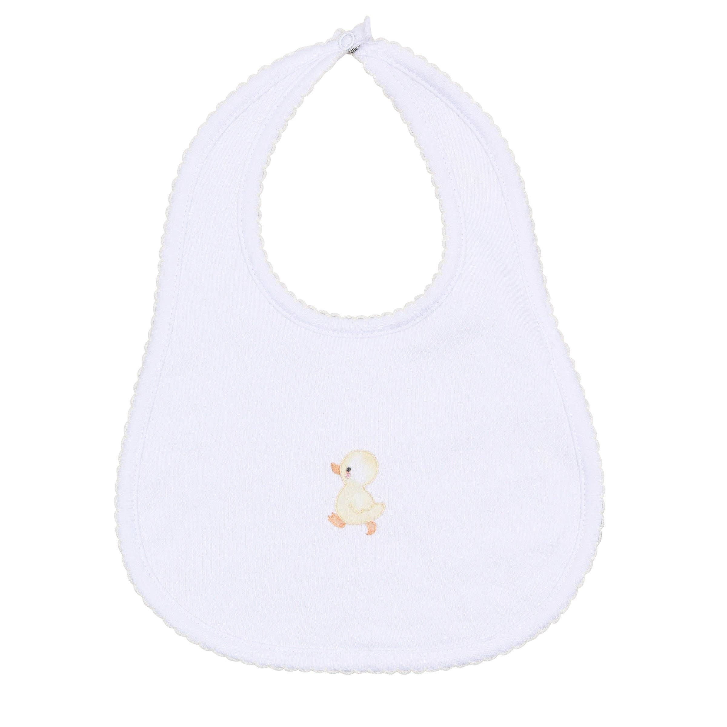 Make mealtime extra special with this classic bib in luxurious Pima Cotton. It features a beautifully hand-embroidered duckling and delicate picot trim along the edge, offering protection while looking absolutely adorable. The convenient snap closure ensures a secure and comfortable fit.