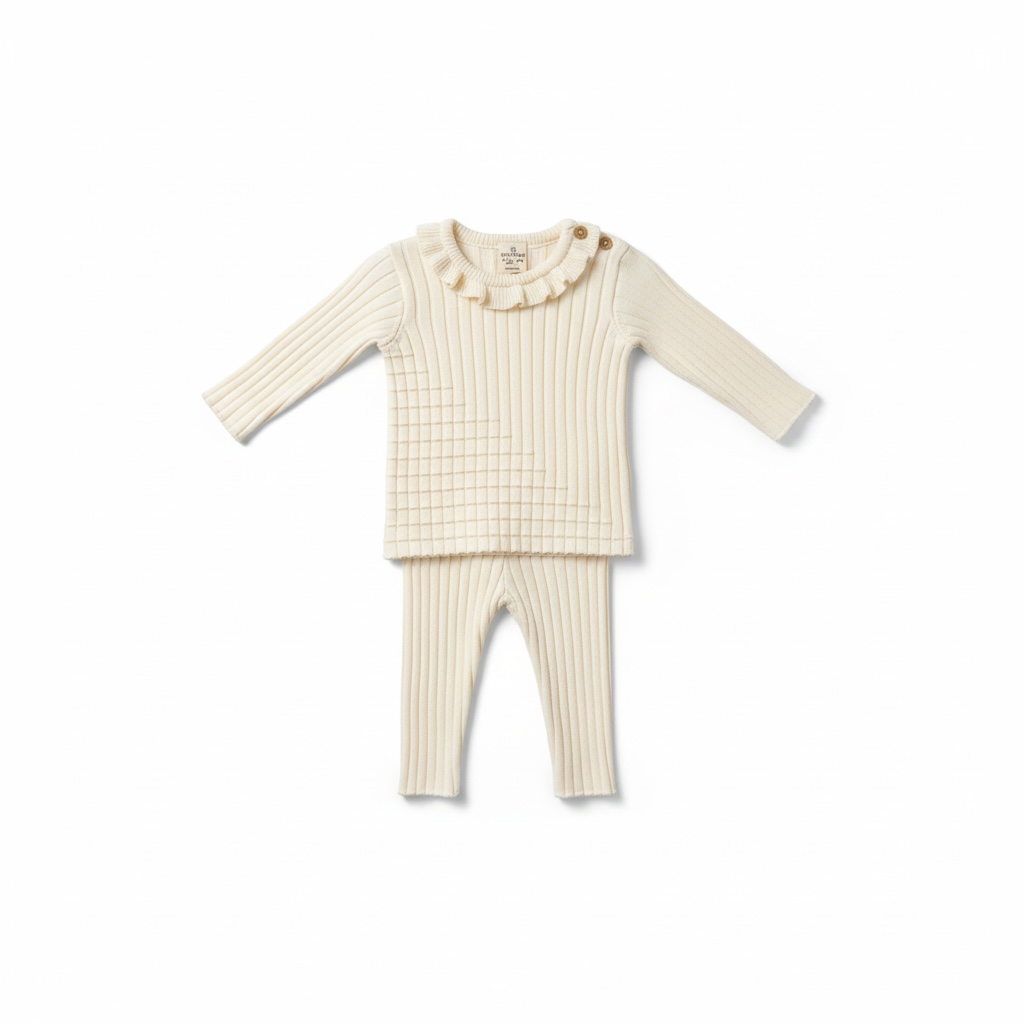 Cozy ivory ribbed knit set featuring a soft, fitted top paired with comfortable matching pants. The textured knit fabric provides gentle stretch and breathability, perfect for active play and all-day wear. This versatile two-piece set transitions seamlessly from casual outings to dressed-up occasions. The classic ivory tone pairs easily with other pieces in your child's wardrobe, while the quality construction ensures durability through countless wears and washes.