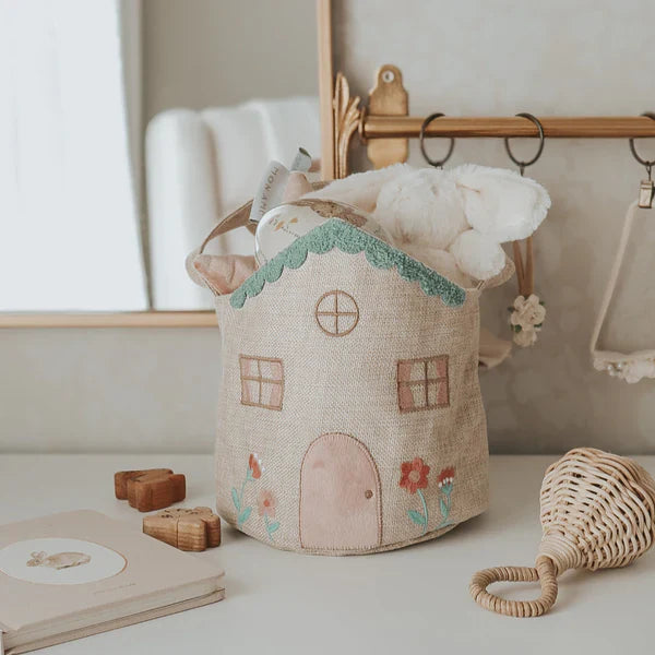 Step into the magic of spring with this charming Cottage Easter basket! Shaped like a sweet little house nestled in a beautifully embroidered blooming garden, this basket is perfect for collecting colorful eggs, tiny treasures, and tasty treats. The soft linen-like texture, pink door, scalloped rooftop, and whimsical flowers make it feel like a fairy’s hideaway, ready to carry all your Easter delights. With its sturdy handle and floral-printed lining, it’s the perfect companion for egg hunts or as an enchanting decor piece. Your little one will love filling this magical cottage with memories for years to come!