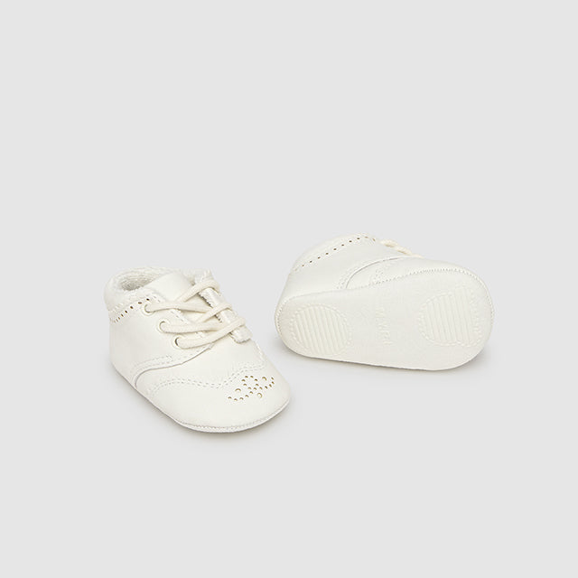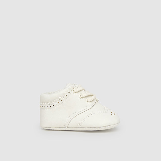 Step into cuteness with these White Baby Boy Lace-Up Blucher Shoes! Designed for little explorers, they offer a snug, adjustable fit with playful laces and a classic blucher style. Perfect for tiny feet, these shoes combine comfort and charm, making every first step a stylish adventure.