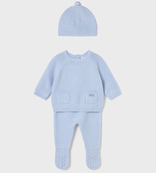Light Blue Knitted Cotton Sweater, Footie & Hat Set
