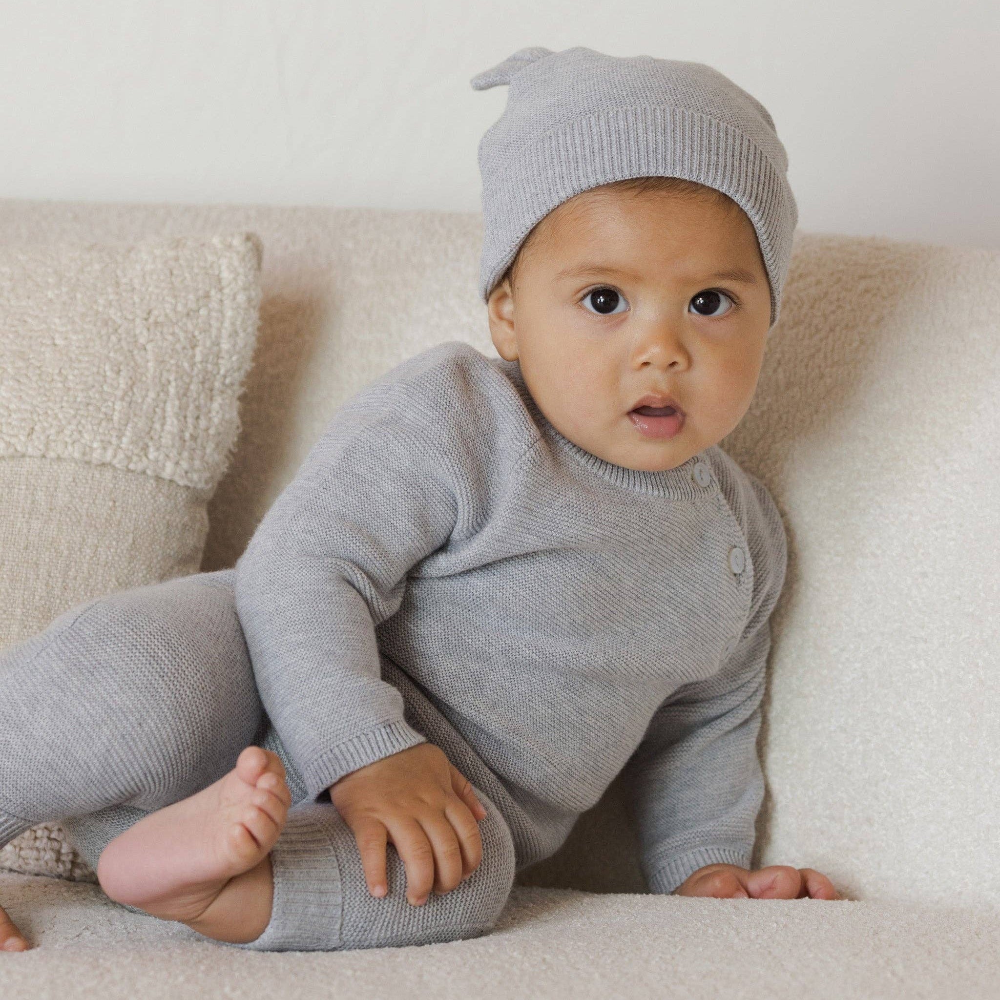 Keep little heads cozy and adorable with this charming cotton knit beanie featuring an endearing bear design. Crafted from soft, breathable cotton, it's perfect for keeping your child warm during cooler days while letting their skin breathe. The dusty blue hue is gentle on the eyes and pairs beautifully with any outfit. With its playful bear details, this beanie transforms a practical accessory into a delightful fashion statement that kids will actually want to wear!