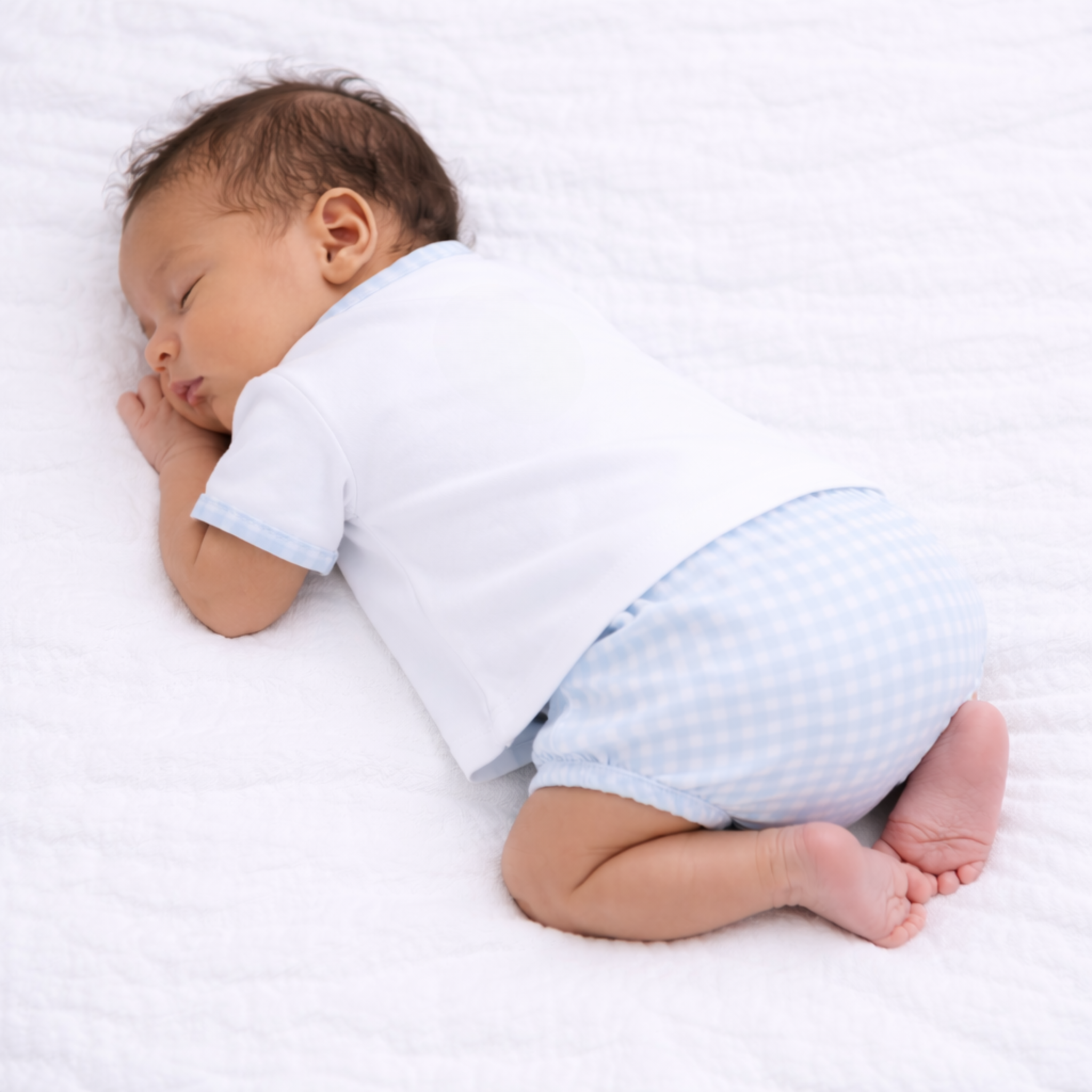 Dress your little one in classic charm with this adorable blue and white gingham 2-piece set! The soft short-sleeve top pairs perfectly with a coordinating diaper cover, creating an effortlessly cute outfit that's ideal for playdates, family gatherings, or everyday wear. The timeless gingham pattern adds a touch of vintage-inspired style, while the comfortable fit keeps your baby happy and content. Perfect for the modern parent who loves traditional details with a contemporary twist!