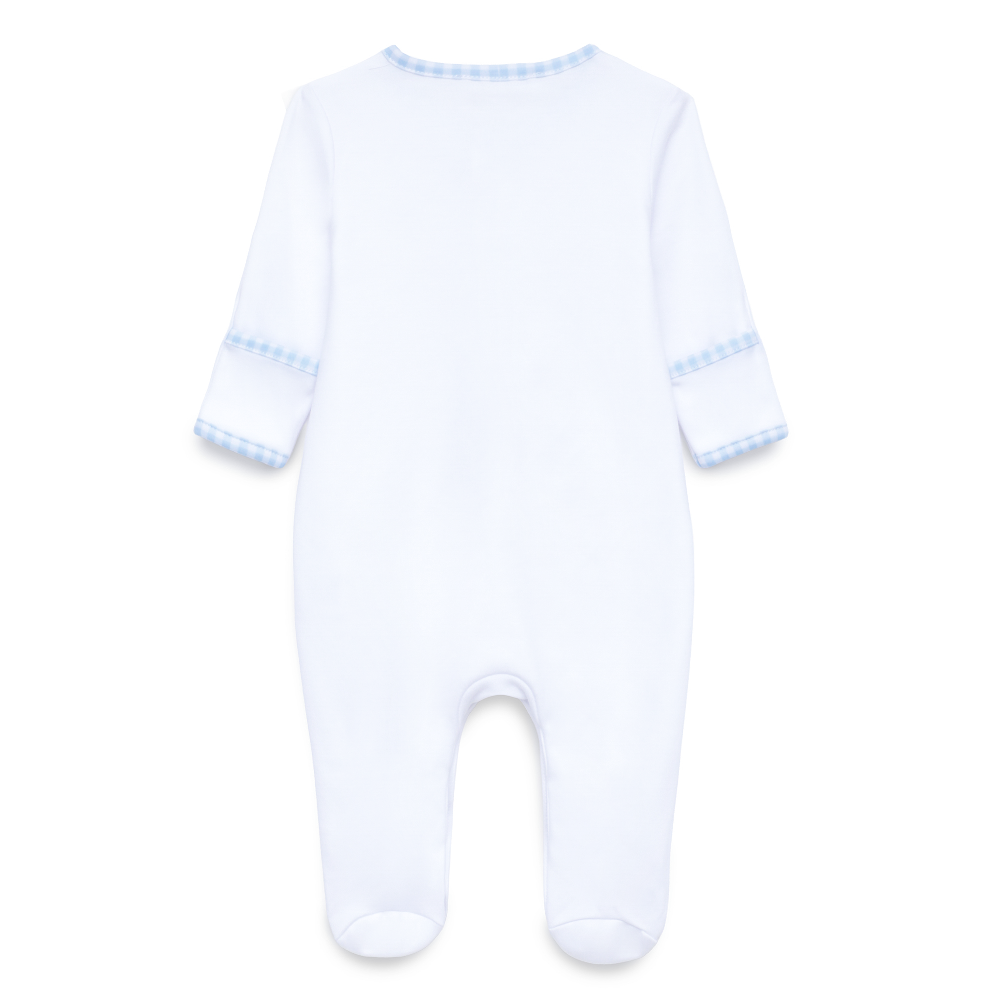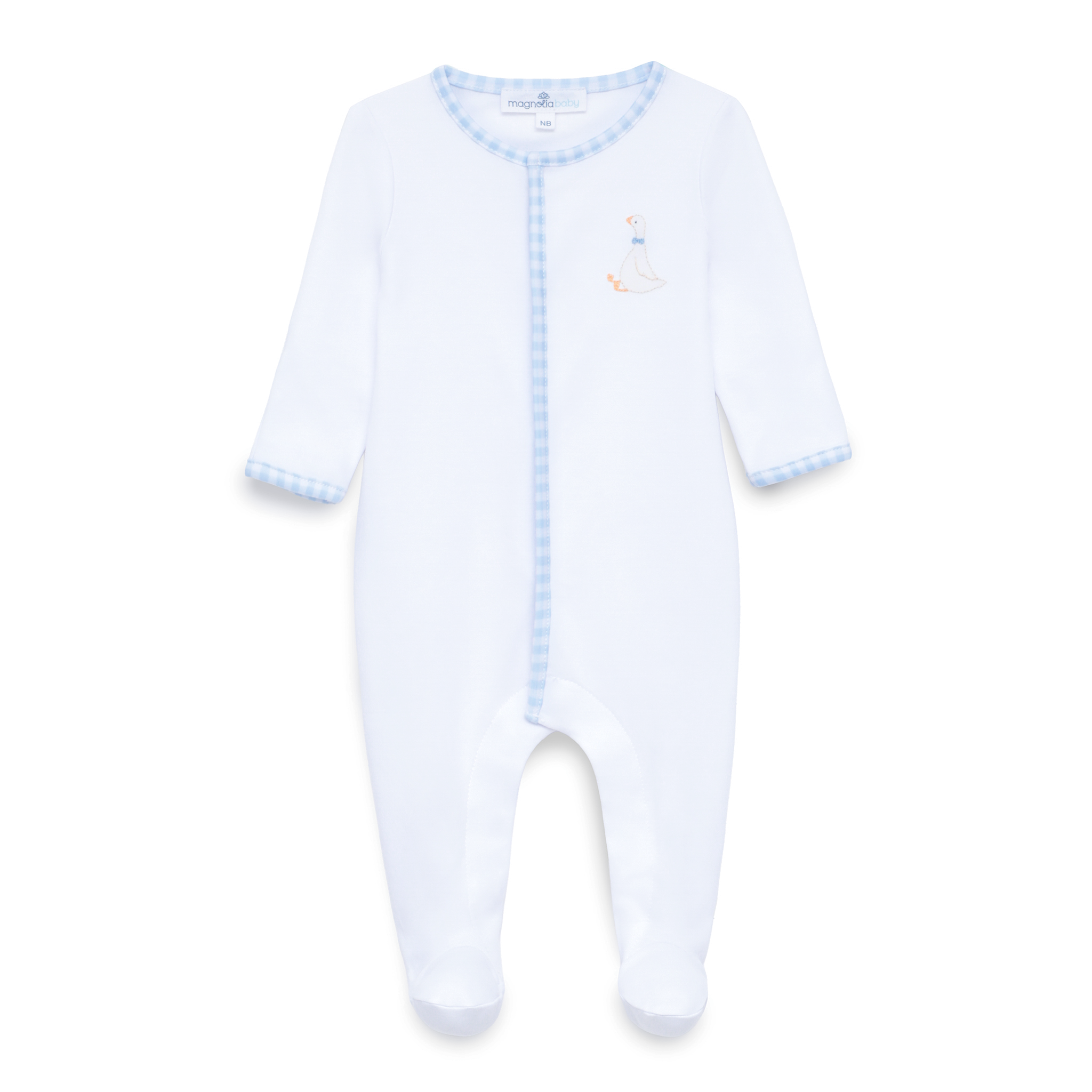 This comfortable footie offers full coverage and traditional style. Luxurious Pima Cotton is accented with a hand-embroidered goose on the chest and finished with a crisp light blue checker trim on the placket and cuffs.