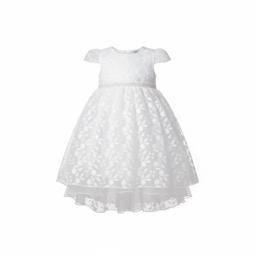 Our twirl and lace dress is made in layers of tulle with a twirl high low cut. The diamond belt and capped sleeves add elegance and fun to this beautiful piece, completed with a matching headband. Floral embroidery cover the dress for dimension and pattern.