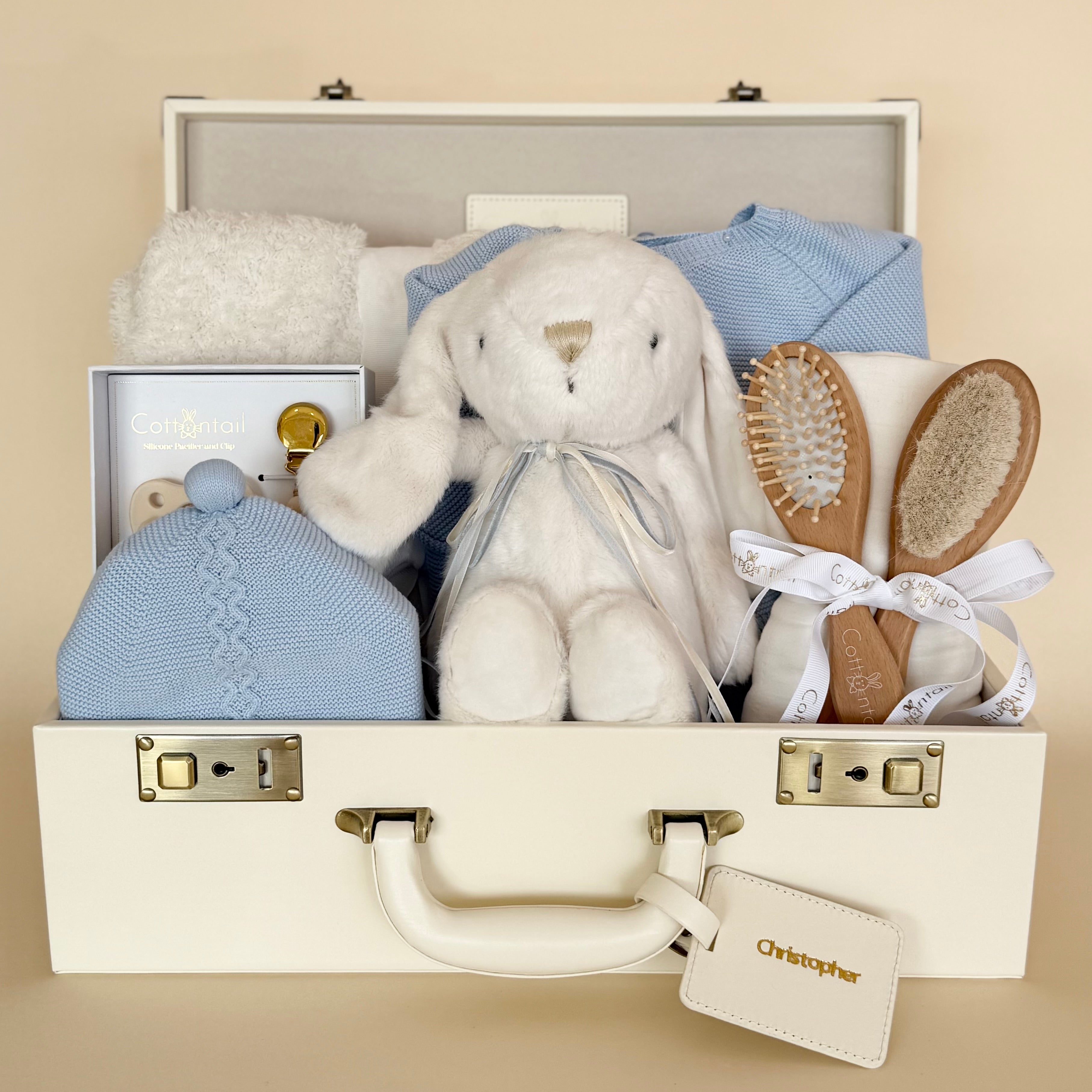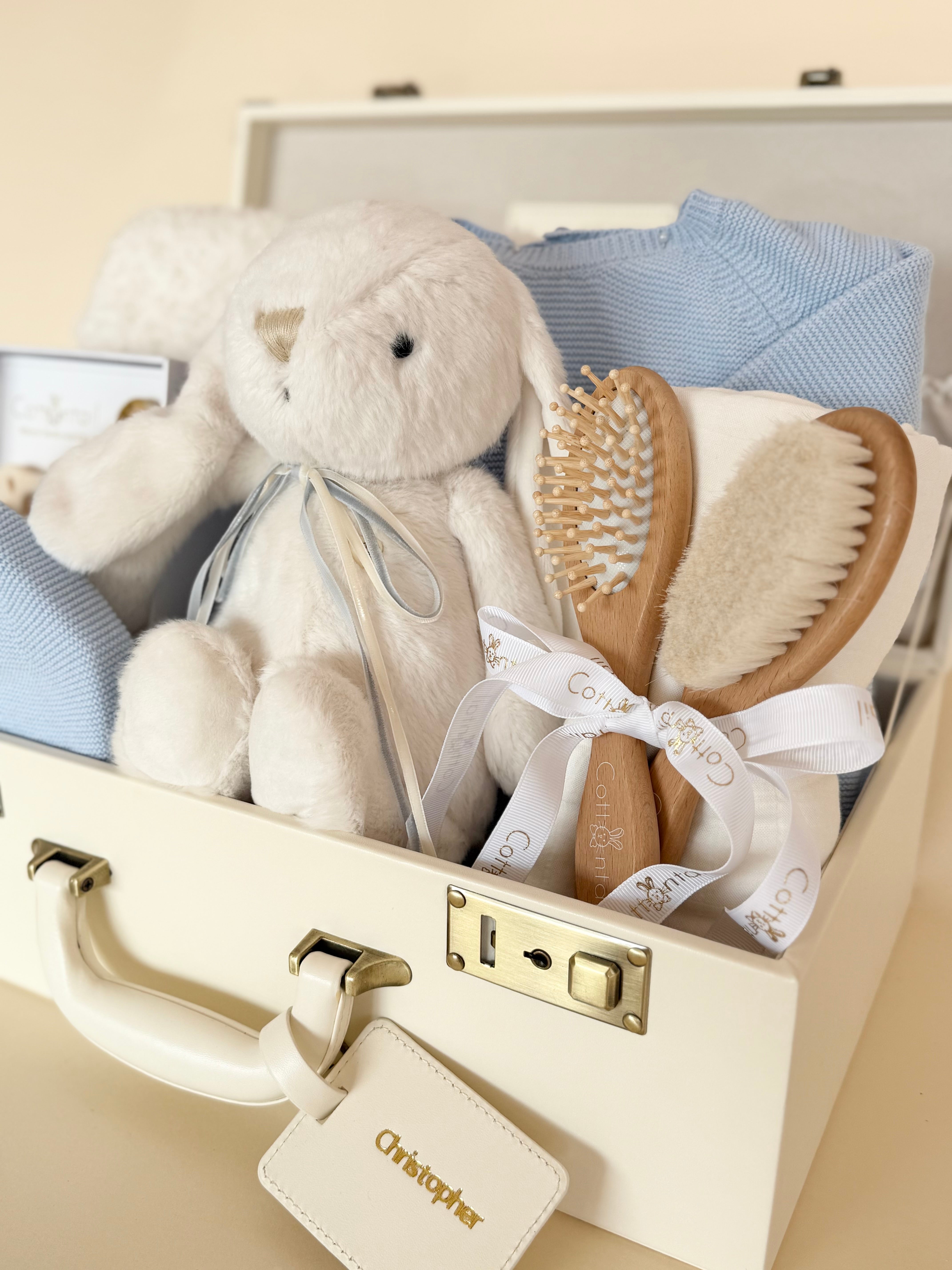 Tucked inside is a cuddly bunny companion ready to become baby’s first friend, along with a gentle brush set for delicate care. A coordinating pacifier with clip adds a practical touch, keeping comfort always within reach.