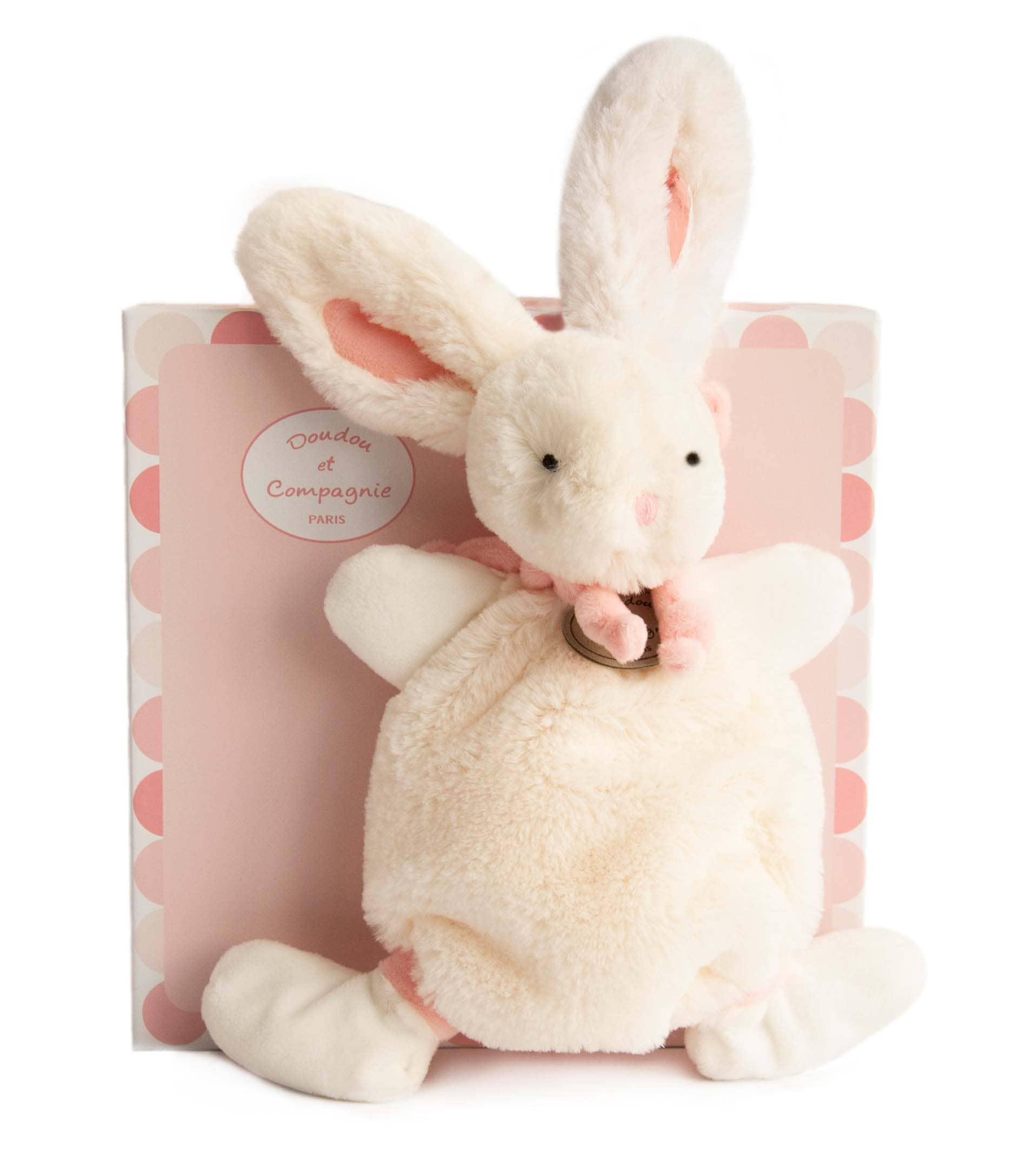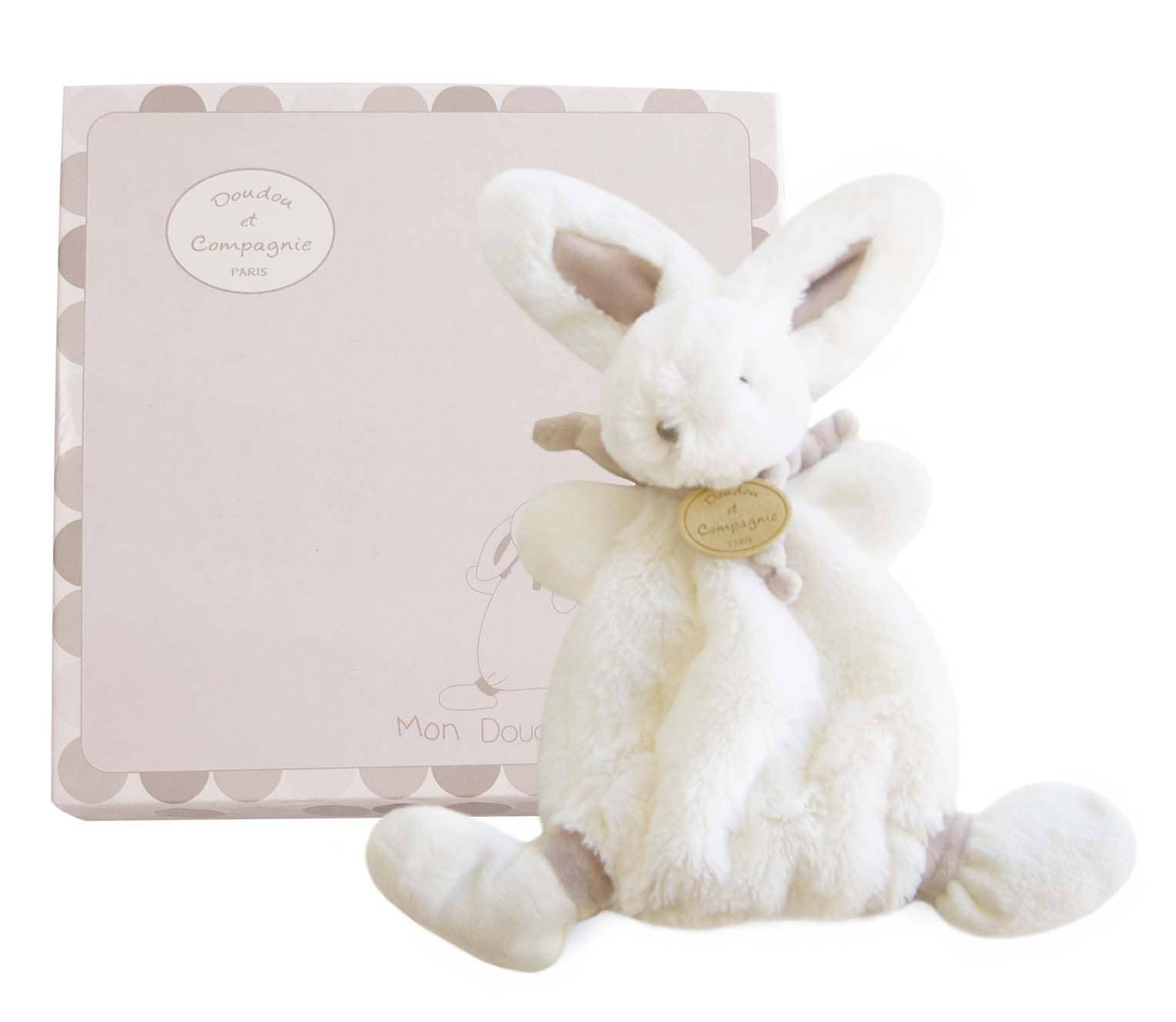 All Doudou et Compagnie’s products are luxuriously designed with the finest, softest fabrics. This cuddly bunny is perfect for any little one. Machine wash gentle cycle and lay flat to dry.