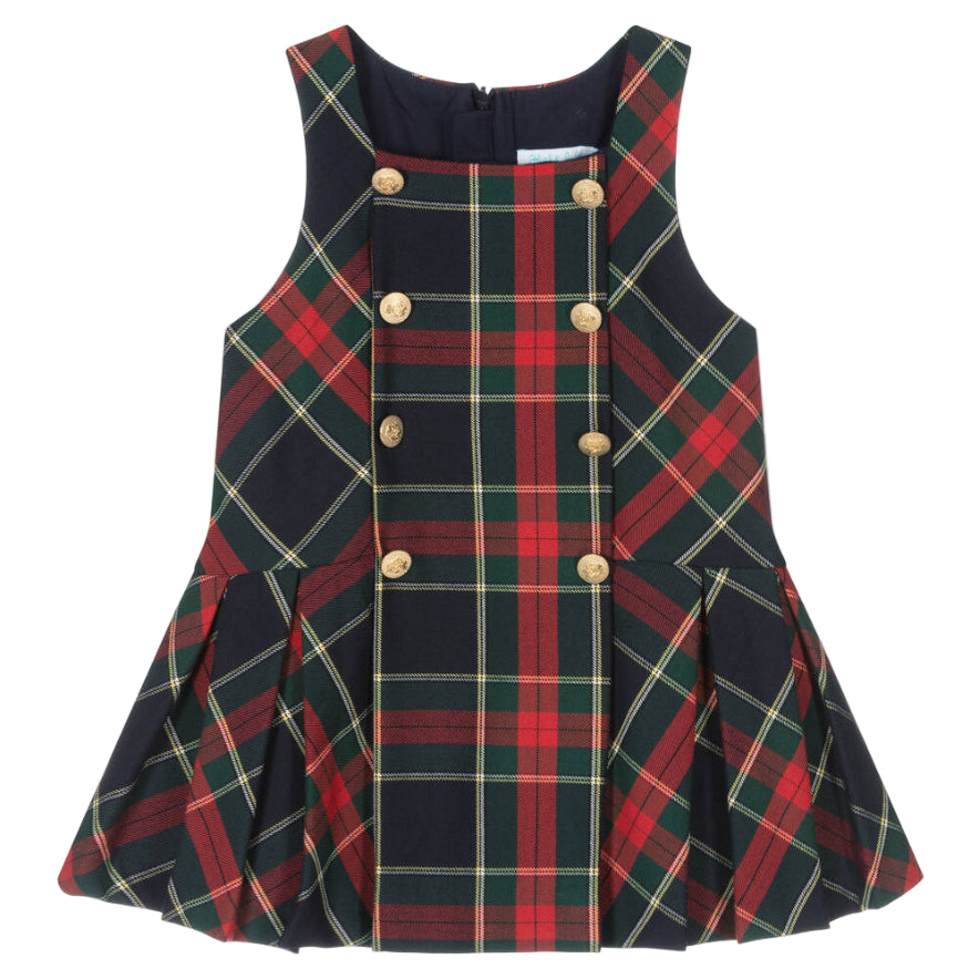 Este lujoso y exclusivo vestido estilo pichi para niñas de Abel & Lula es un clásico atemporal. Con un sofisticado patrón de tartán azul marino, rojo y verde, presenta una falda plisada y botones con efecto dorado para una apariencia que seguramente llamará la atención. La suave sarga de mezcla de viscosa está completamente forrada en algodón ligero para mayor comodidad y se abrocha fácilmente con una cremallera oculta en la espalda.
