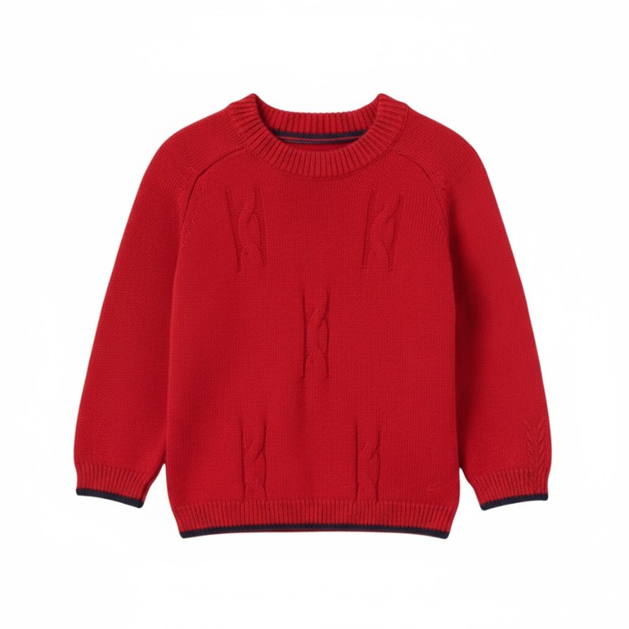 Confeccionado con una lujosa mezcla de lana y algodón y con detalles clásicos de tejido trenzado, este suéter rojo para niño es la manera perfecta de agregar un toque de sofisticación al guardarropa de tu pequeño. Con escote acanalado y ribete negro, esta lujosa prenda de punto lo mantendrá abrigado y le ofrecerá un estilo atemporal.