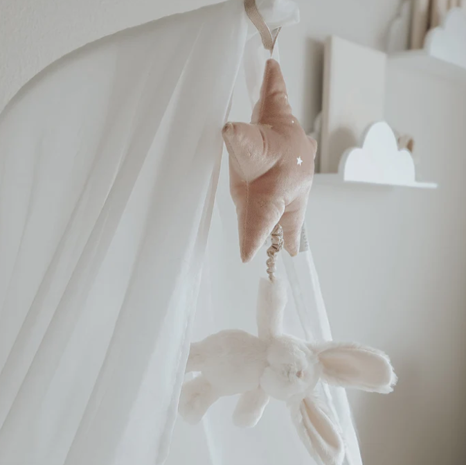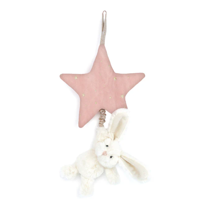 Give the gift of sweet dreams with our enchanting Bunny Music Mobile! This cuddly little bunny, with its soft fur and gentle Brahm's lullaby, is ready to whisk babies off to dreamland. Just give the plush bunny a gentle tug, and let the soothing melody work its magic. The pink foil printed star adds a touch of sparkle and easily attaches to cribs or strollers with a Velcro loop, bringing cozy comfort anywhere. A charming baby shower gift, it's music to every baby's (and parent's) ears!