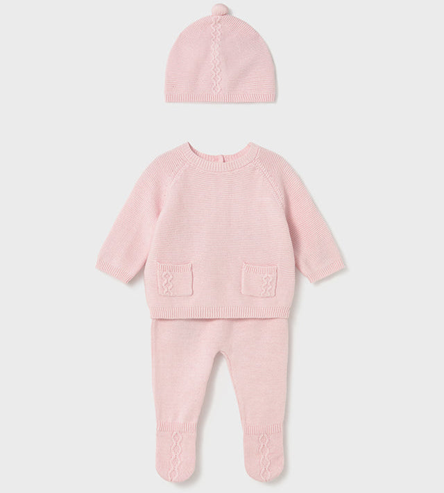 Baby Pink Knitted Cotton Sweater, Footie & Hat Set