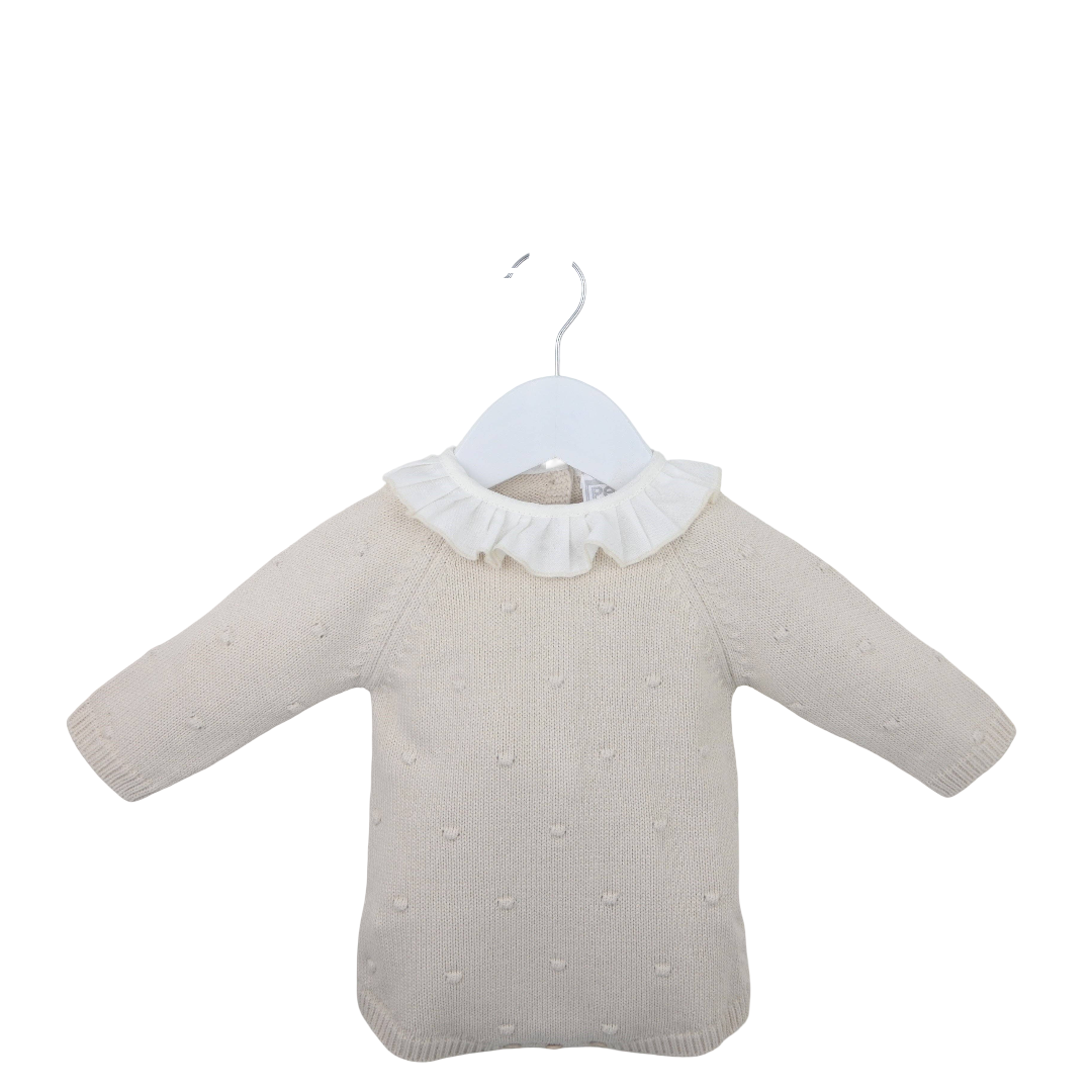 Keep your little one cozy and adorable in this Cream Baby Girl Knit Sweater featuring a charming textured dot pattern and a delicate white ruffle collar. Perfect for adding playful style and gentle warmth to any outfit, it’s soft against baby’s skin and ready for all her little adventures.