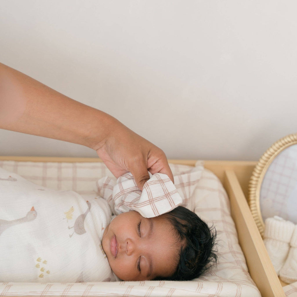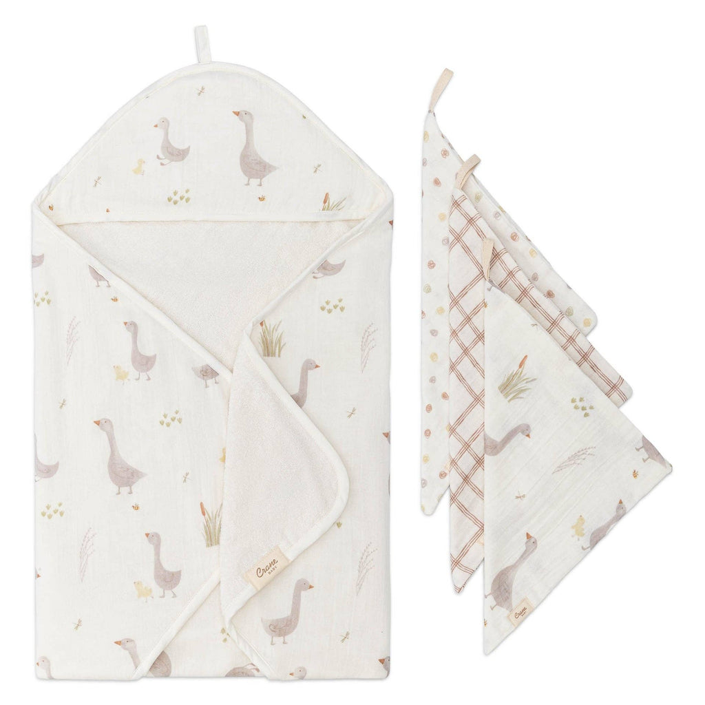 With its adorable goose design and soft cotton terry fabric, this hooded towel and washcloth set brings calm charm to bath time. The hood keeps baby warm after a soak, while the muslin cotton washcloths are perfect for gentle cleansing.