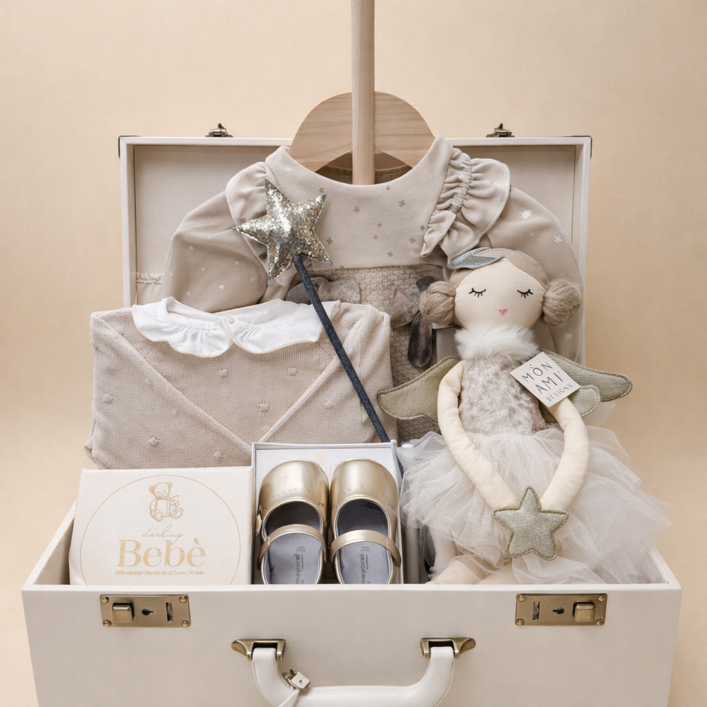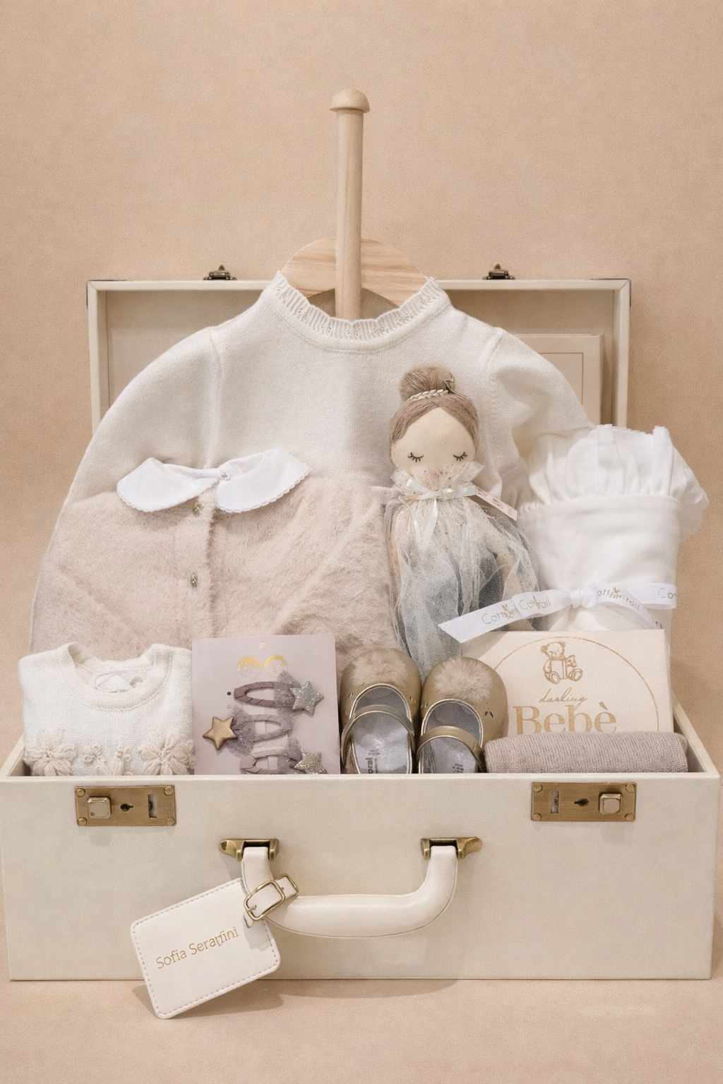 Our designers will curate a collection of elegant pieces and display them beautifully in our one-of-a-kind vegan leather memory case, which later can be used to house memories from the baby's early years. We take great care to ensure the items in each gift set harmoniously match in color scheme and cater to the appropriate season for baby to use throughout the growing years.