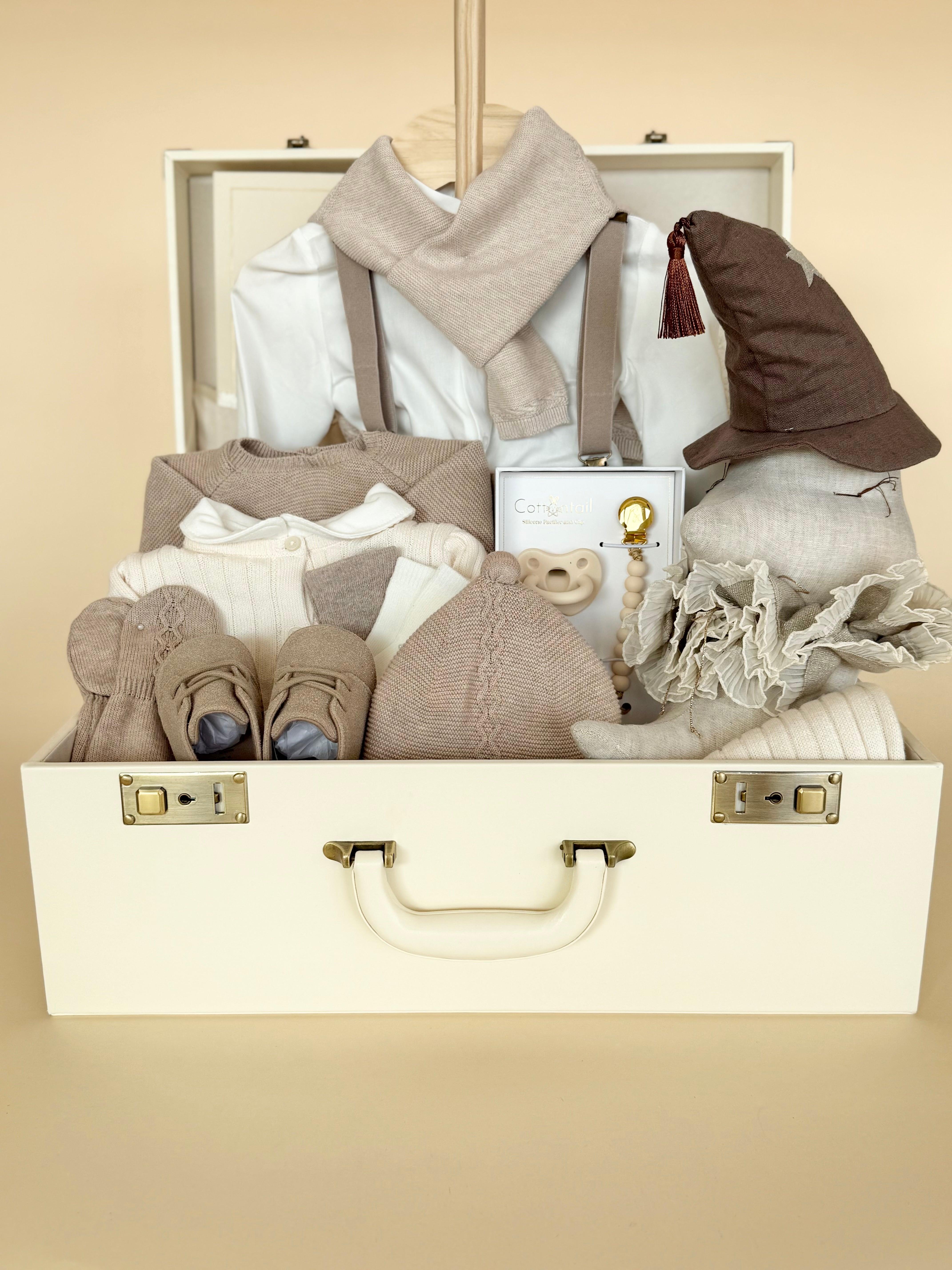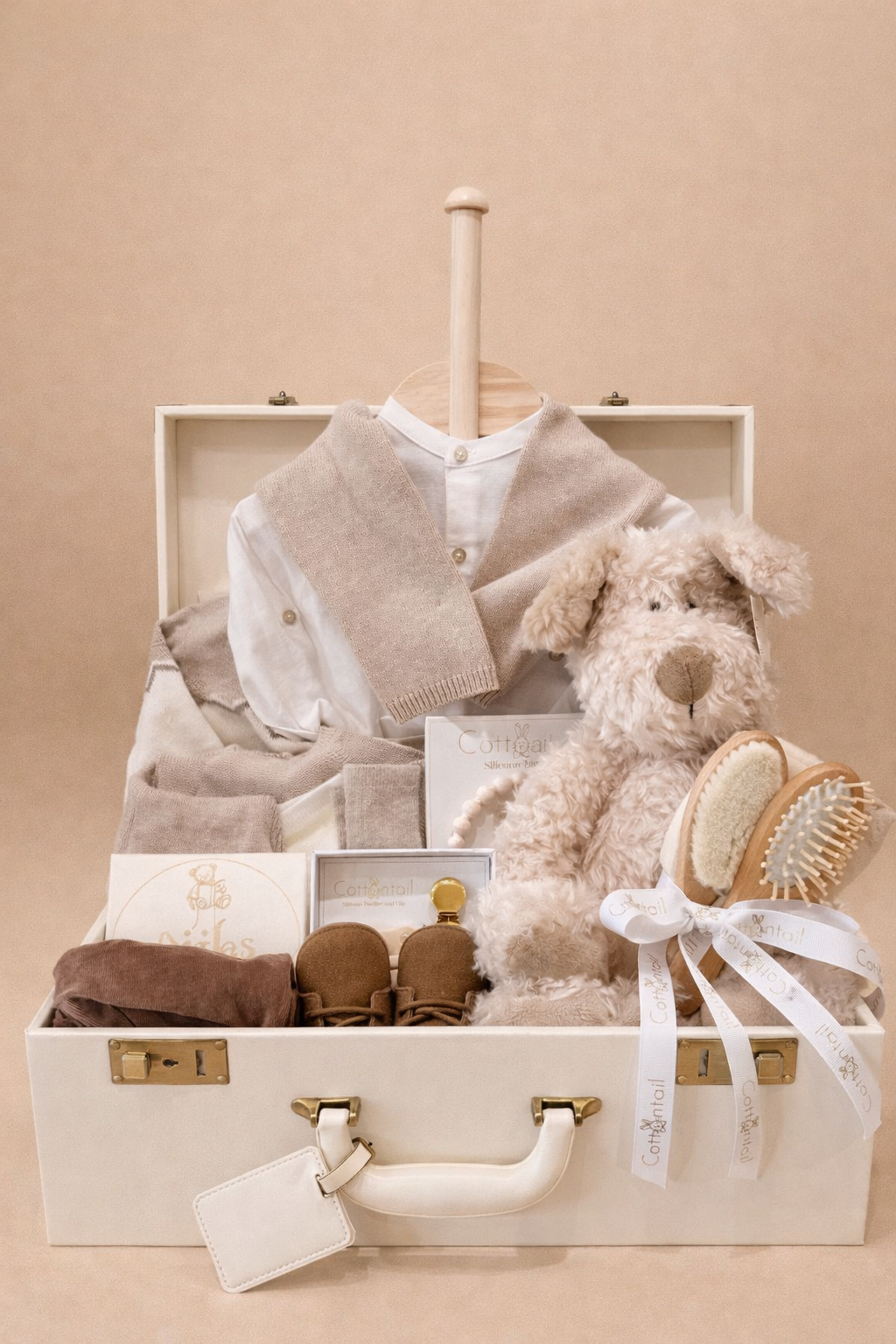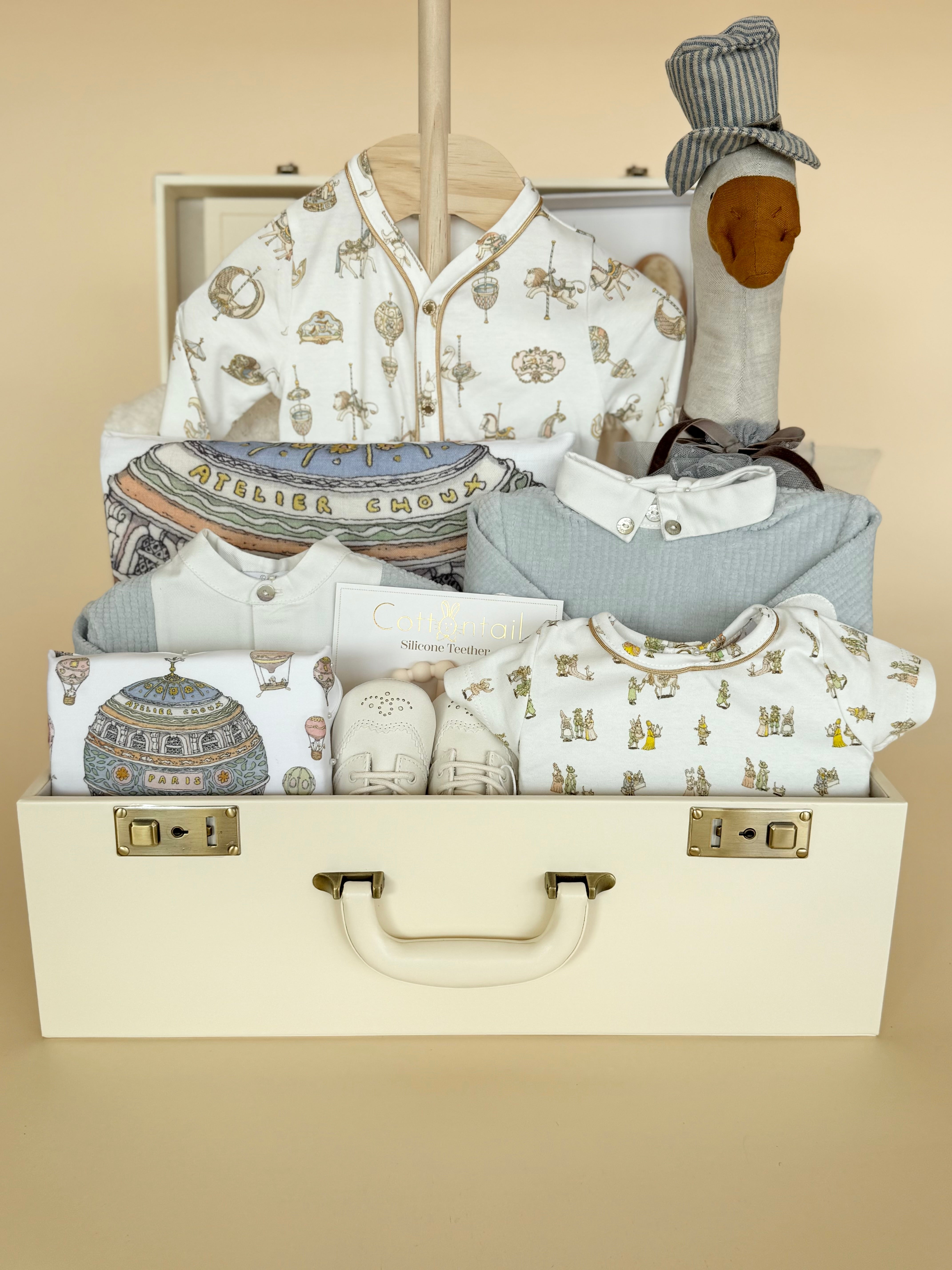 Our designers will curate a collection of elegant pieces and display them beautifully in our one-of-a-kind vegan leather memory case, which later can be used to house memories from the baby's early years. We take great care to ensure the items in each gift set harmoniously match in color scheme and cater to the appropriate season for baby to use throughout the growing years.