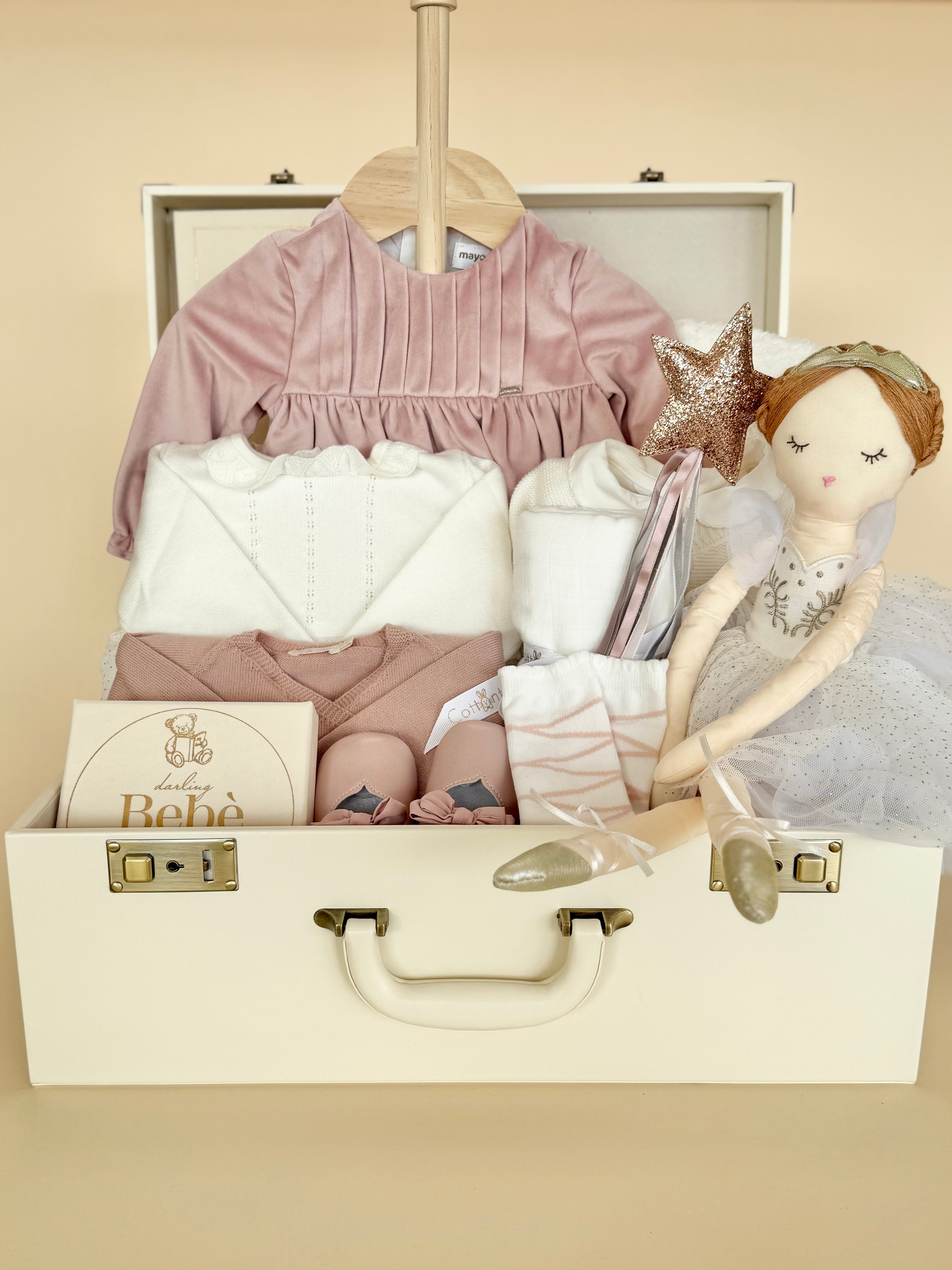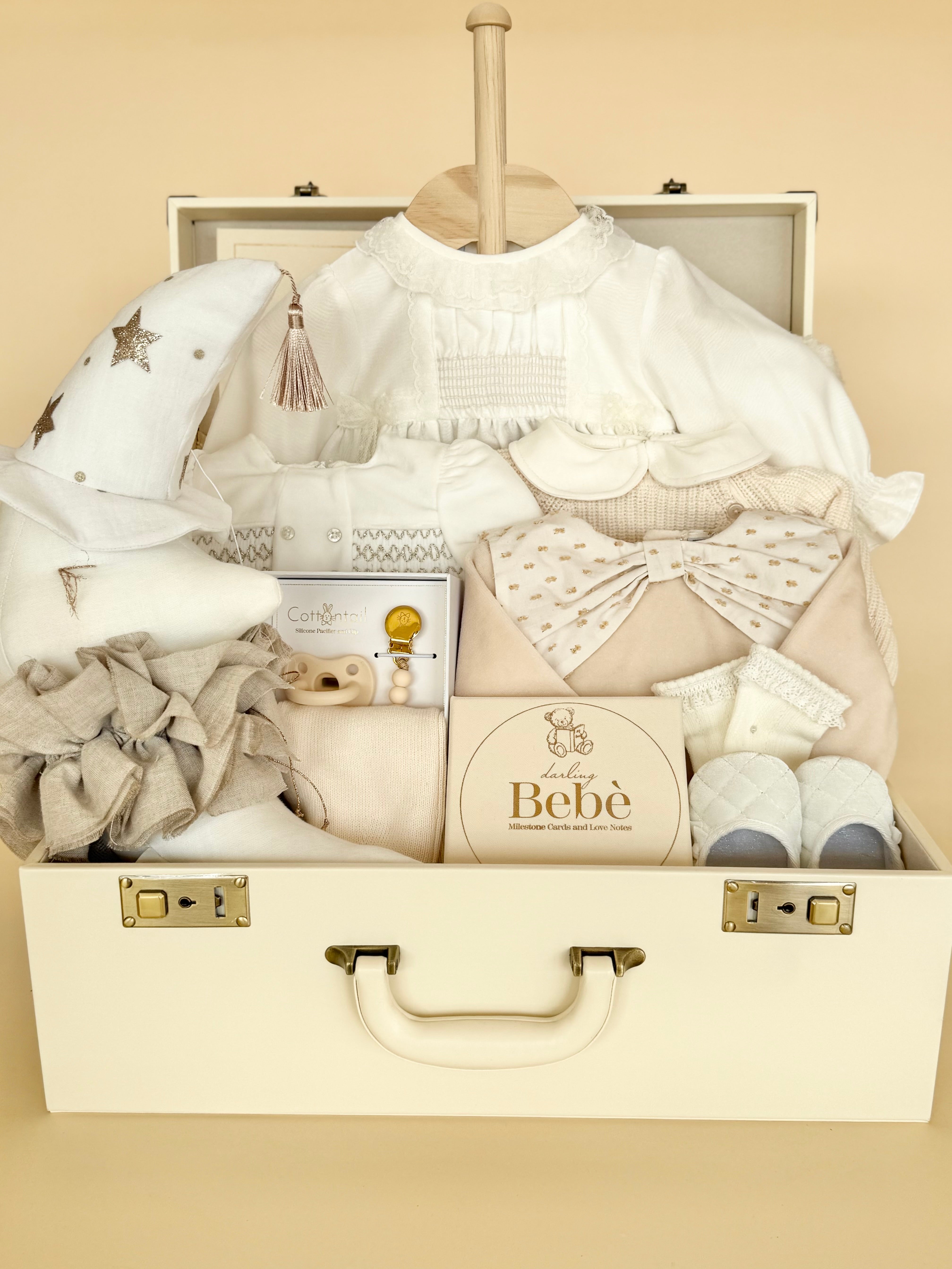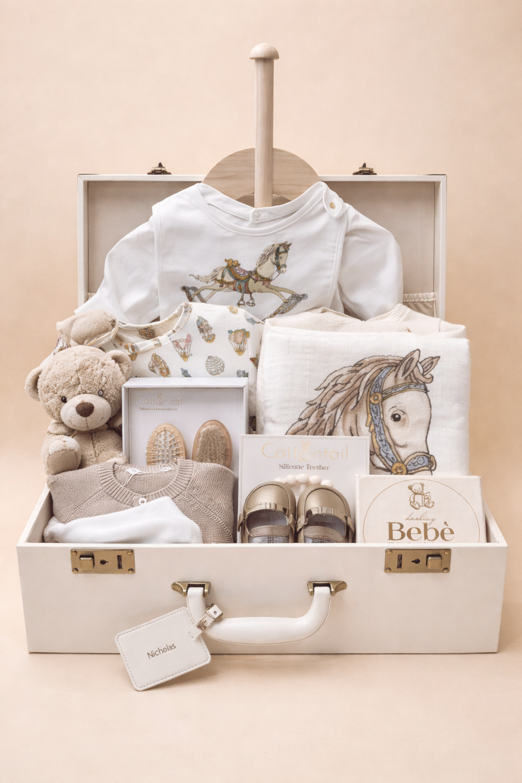 Our designers will curate a collection of elegant pieces and display them beautifully in our one-of-a-kind vegan leather memory case, which later can be used to house memories from the baby's early years. We take great care to ensure the items in each gift set harmoniously match in color scheme and cater to the appropriate season for baby to use throughout the growing years.