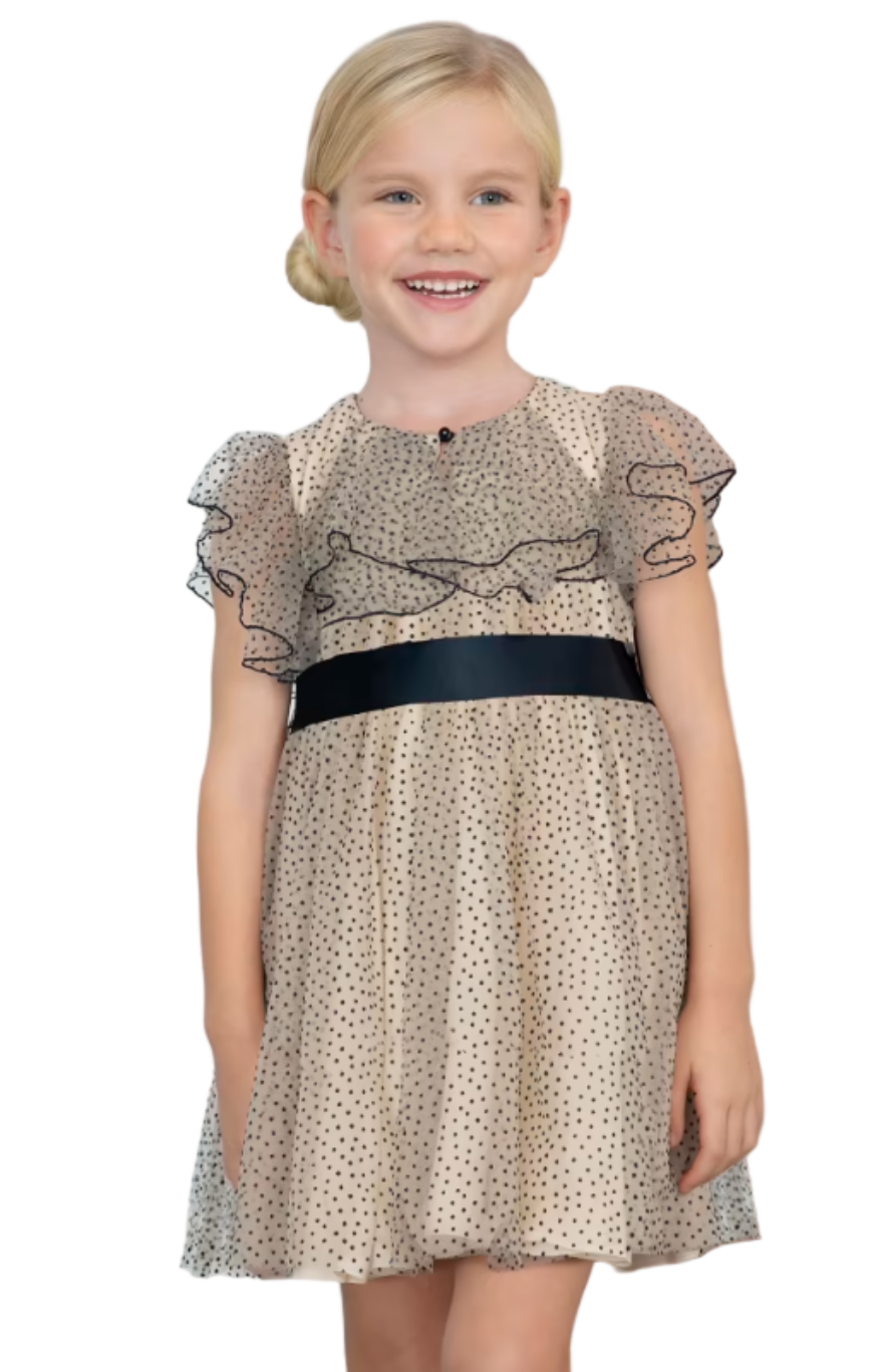 This charming tulle dress for girl is adorned with navy polka dots and delicate ruffles on the short sleeves. A unique ruffle layer at the front and an eye-catching tie of grosgrain ribbon at the waist create a look that is exquisite yet playful. With an interior lining and back opening with an invisible zipper, this dress is sure to make her shine like a star.