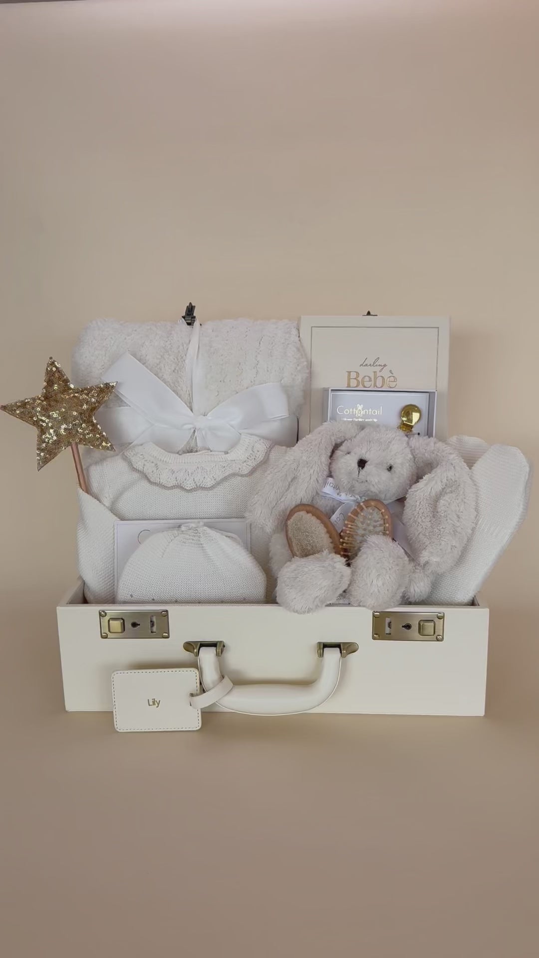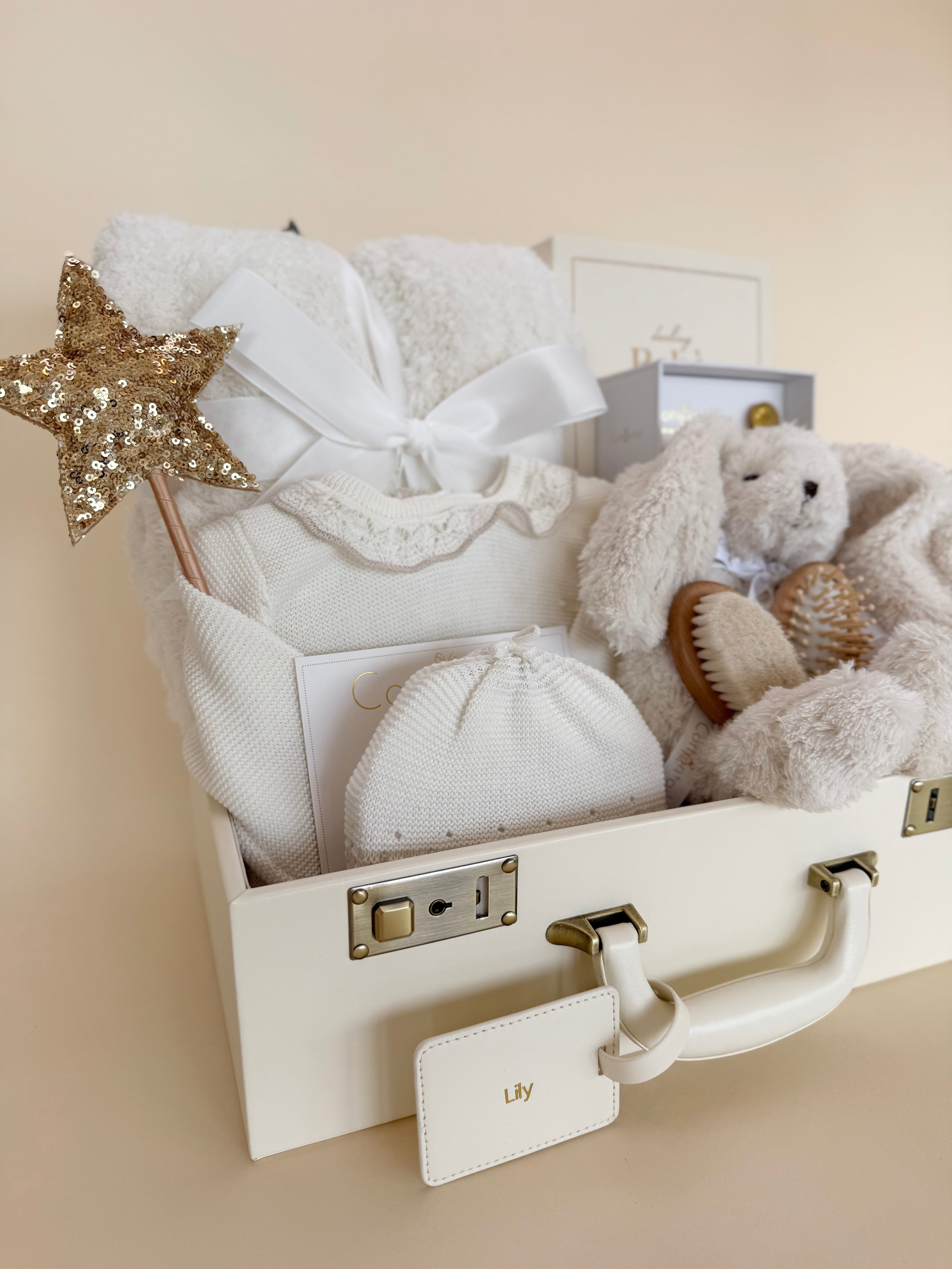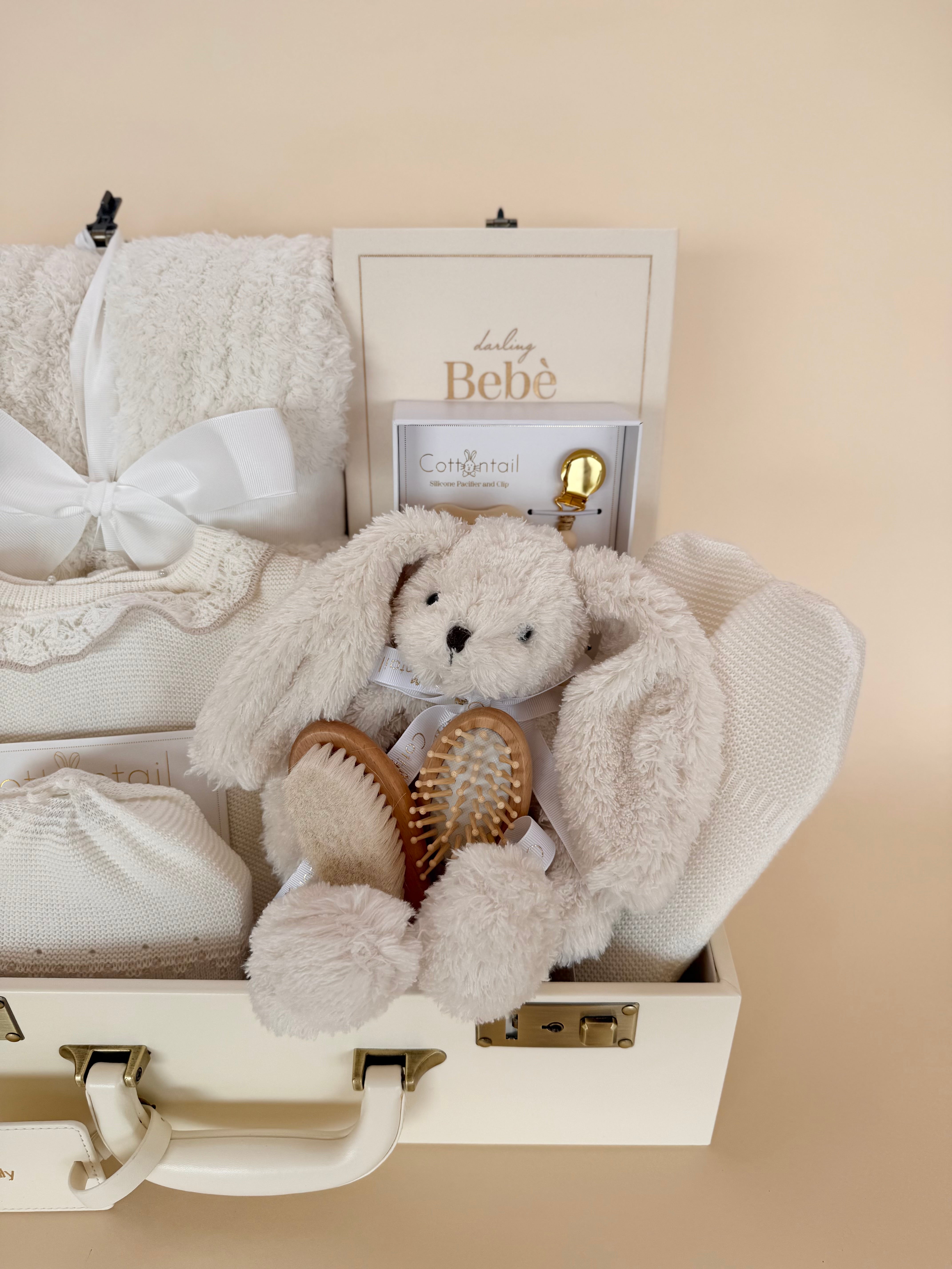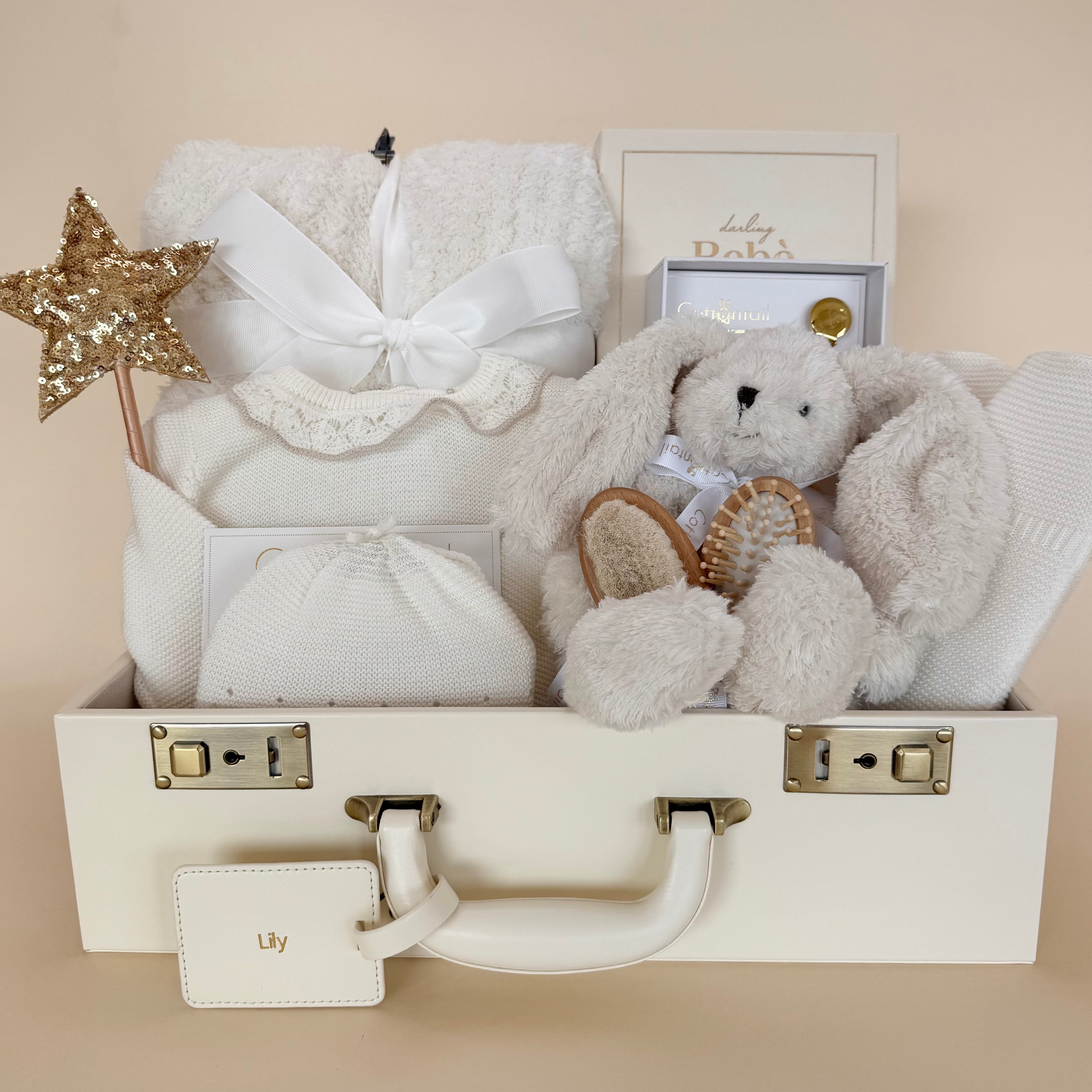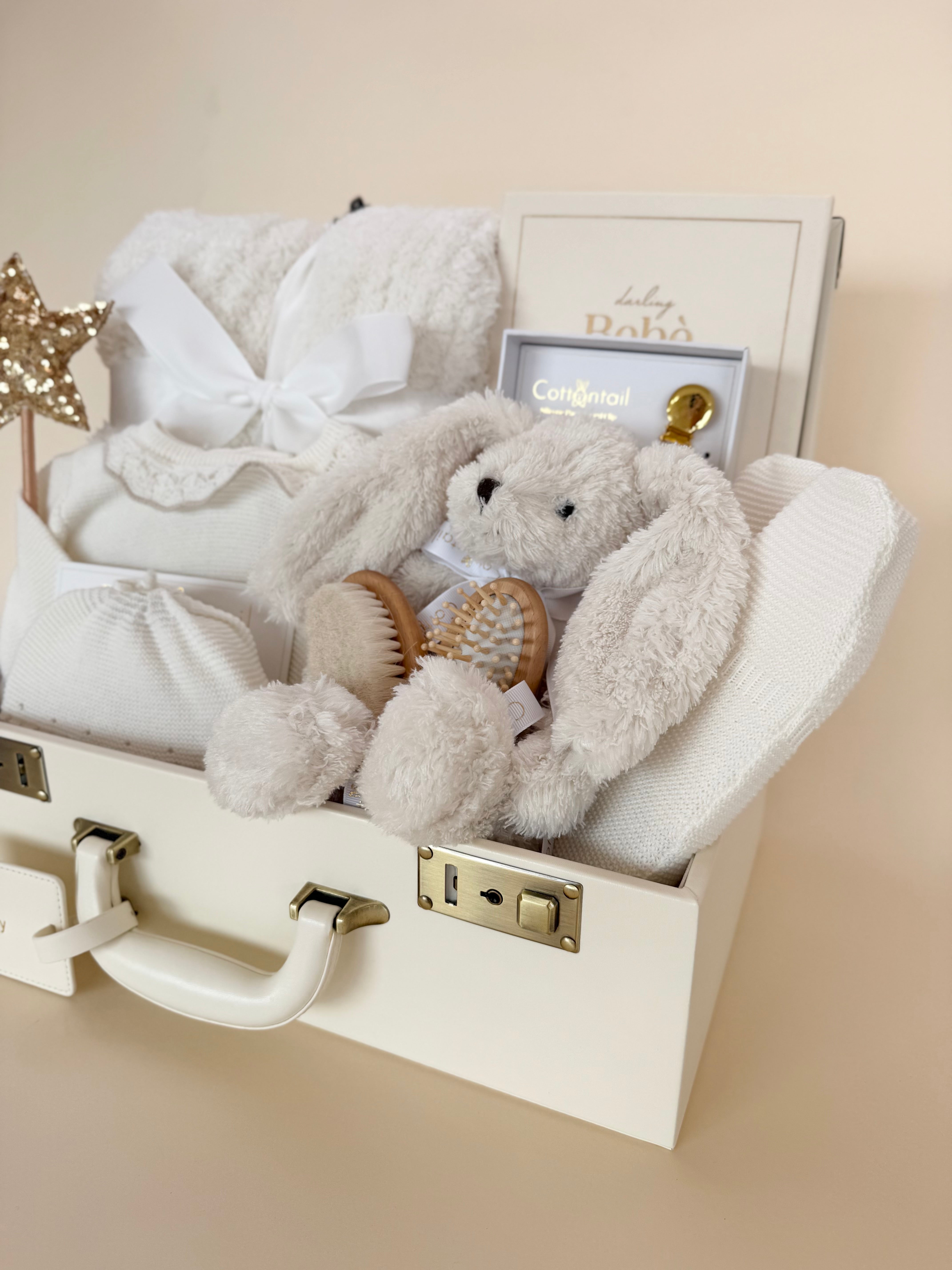 This keepsake features a three-piece layered set with a matching hat, crafted for comfort and effortless elegance. A plush, softly textured blanket adds warmth for cozy moments, while a pacifier and clip set and teether provide practical everyday essentials. To capture baby’s earliest memories, a baby journal is included. A cuddly plush bunny, paired with a shiny gold wand, completes the basket with a refined hint of whimsy.