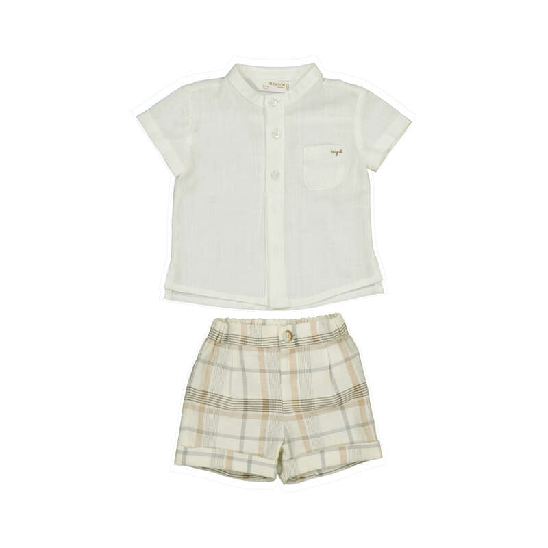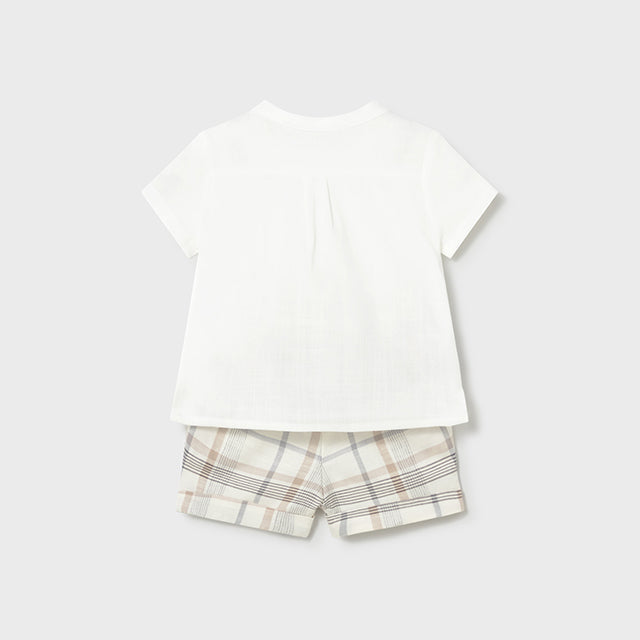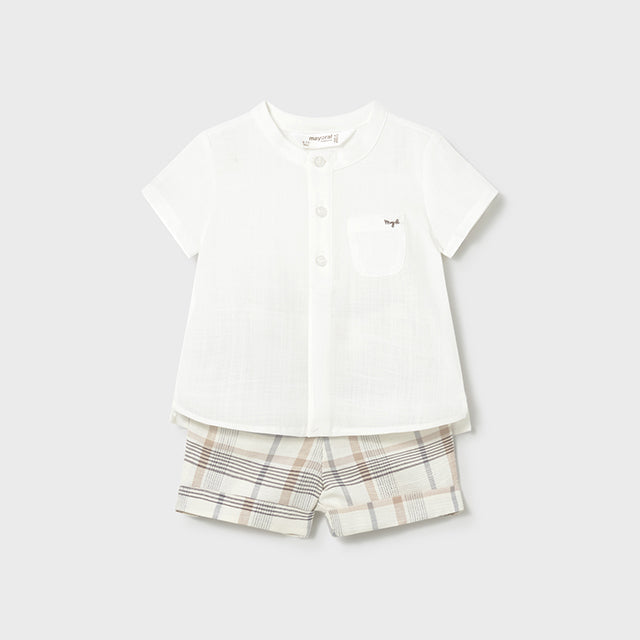 Keep your little guy looking sharp and feeling breezy in this fun 2-piece plaid shorts set! The crisp white short-sleeve shirt features a trendy mandarin collar that adds a modern twist, while coordinating plaid shorts complete the look. Perfect for warm-weather fun, casual outings, or family gatherings, this set delivers style without the fuss. The breathable fabric keeps him comfortable during playtime, and the playful plaid pattern brings personality to his wardrobe. Easy to mix and match with other pieces, this versatile outfit is a go-to choice for parents who want their son looking effortlessly put-together all season long.