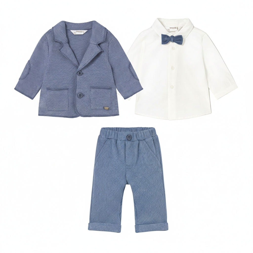 Introduce your little gentleman to timeless elegance with this sophisticated blue blazer and pants set. Crafted for the modern child, the blazer features practical front pockets and a polished silhouette that transitions seamlessly from special occasions to upscale casual wear. The coordinated pants complete the refined ensemble, offering comfort without compromising style. Perfect for weddings, family portraits, or any occasion calling for dapper sophistication, this two-piece collection ensures your son looks impeccably put-together while maintaining the ease of movement children need.