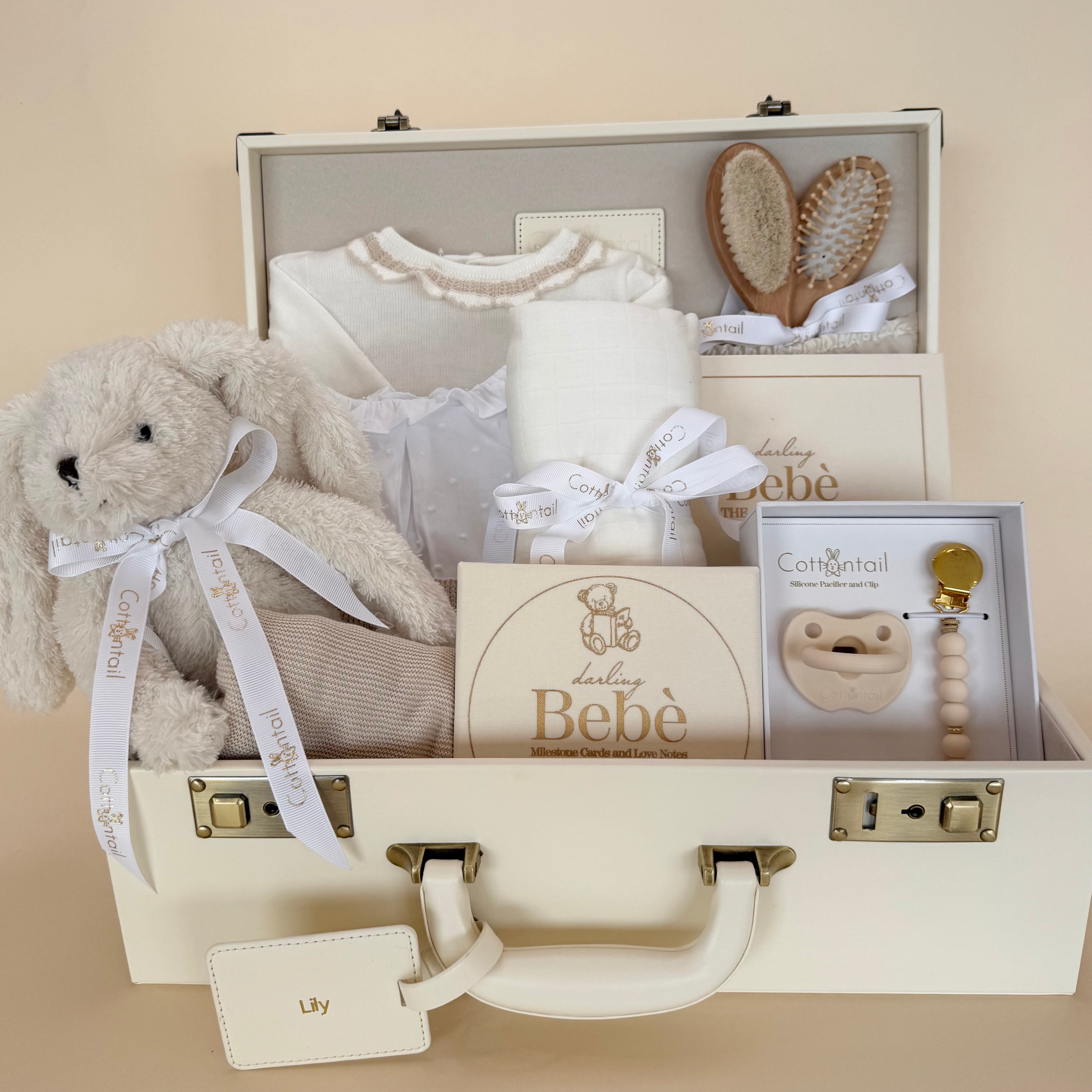 Finished with a plush white bunny for comfort and companionship, this keepsake set is a beautiful and practical gift—perfect for welcoming a baby girl in the most timeless way.