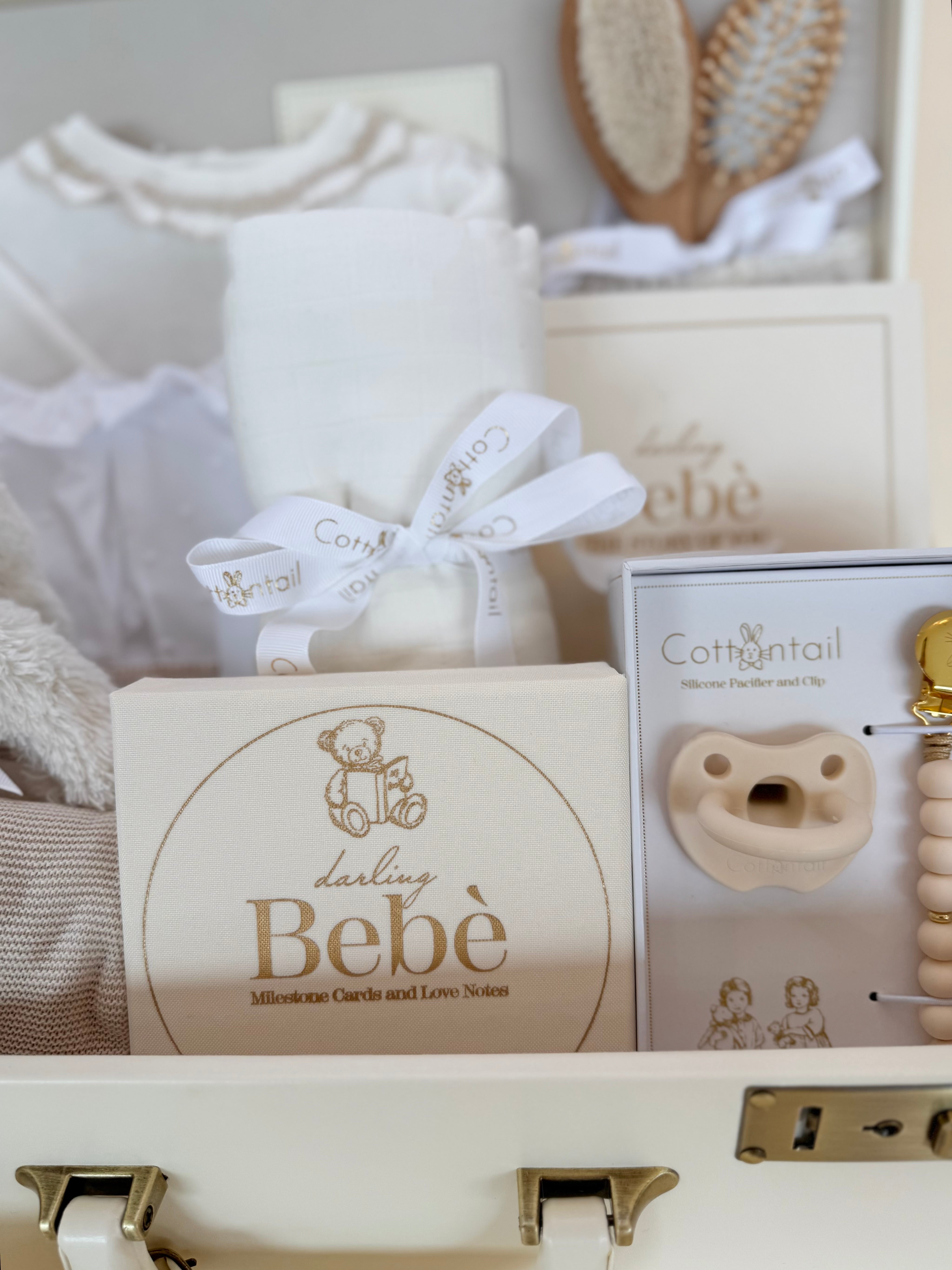 A linen-covered baby journal, accompanied by matching milestone cards, offers a meaningful way to document cherished firsts. Gentle essentials include a coordinating pacifier and clip set, a bamboo brush and comb set for tender care, and a softly textured muslin swaddle blanket ideal for cuddling or nursery styling.