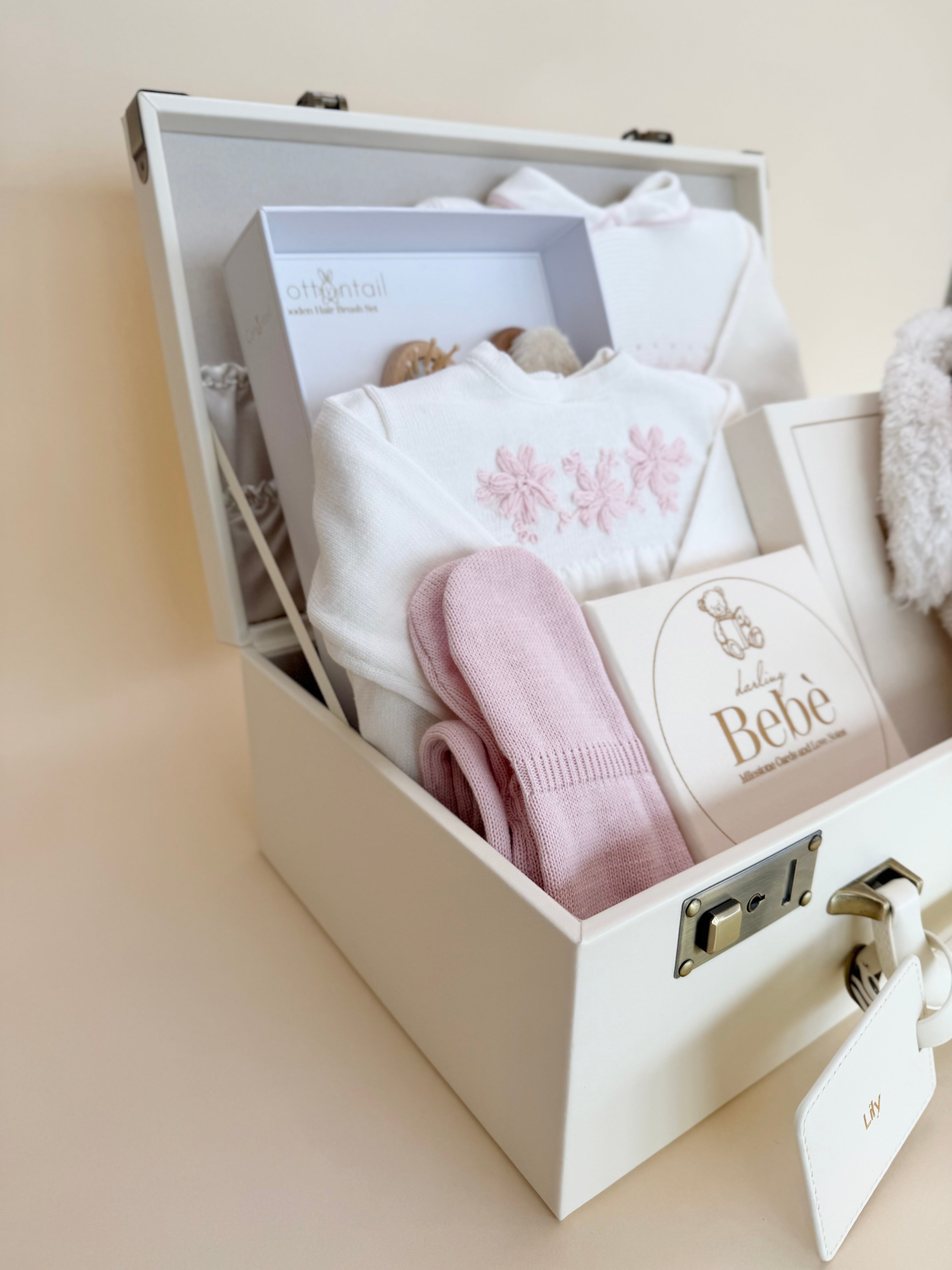 A dreamy keepsake designed to celebrate life’s sweetest beginnings. Our Bunny Wishes Keepsake Basket is thoughtfully curated with timeless knit essentials and cherished mementos, all beautifully presented in an elegant suitcase-style keepsake box.