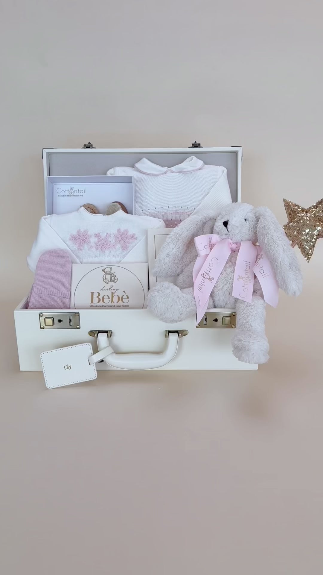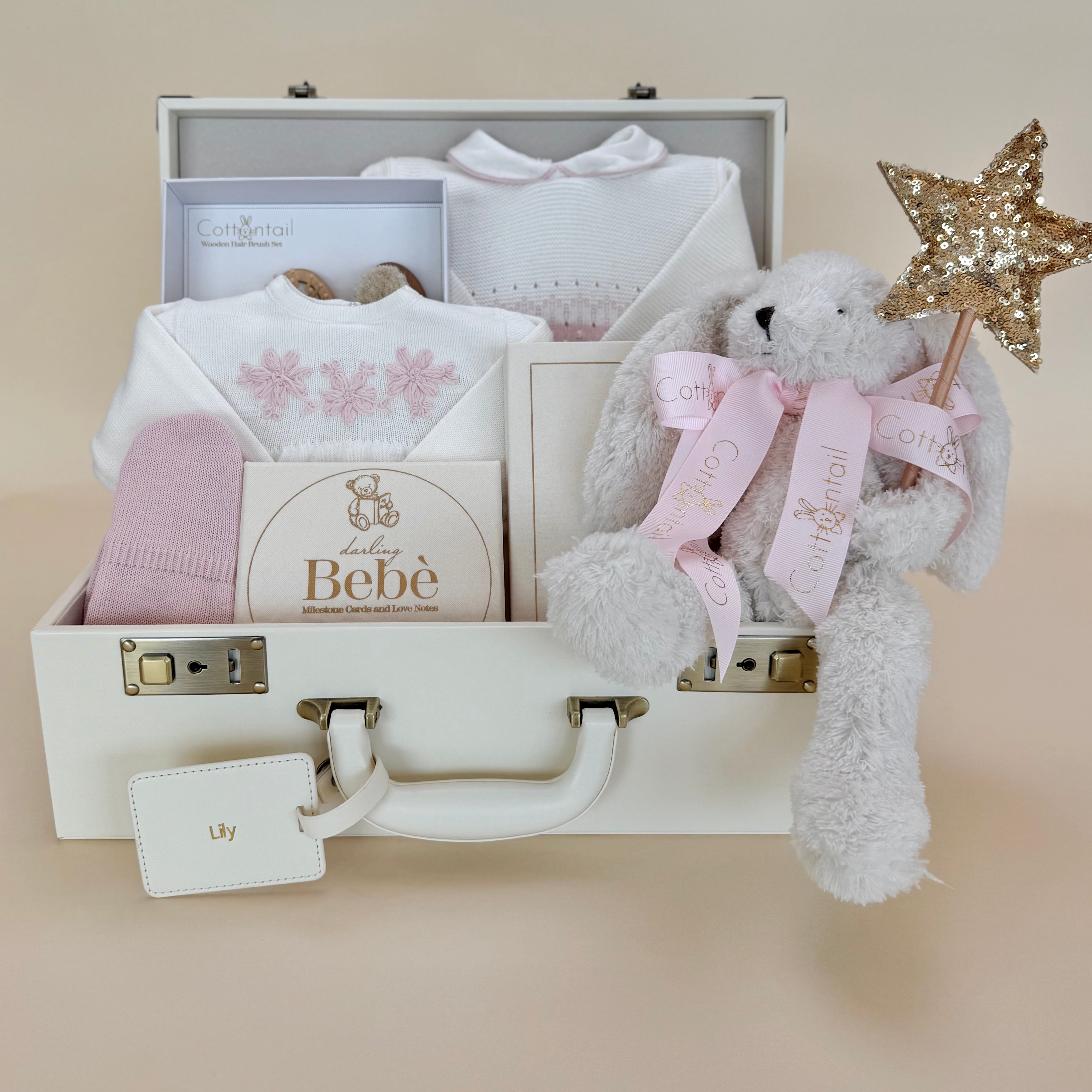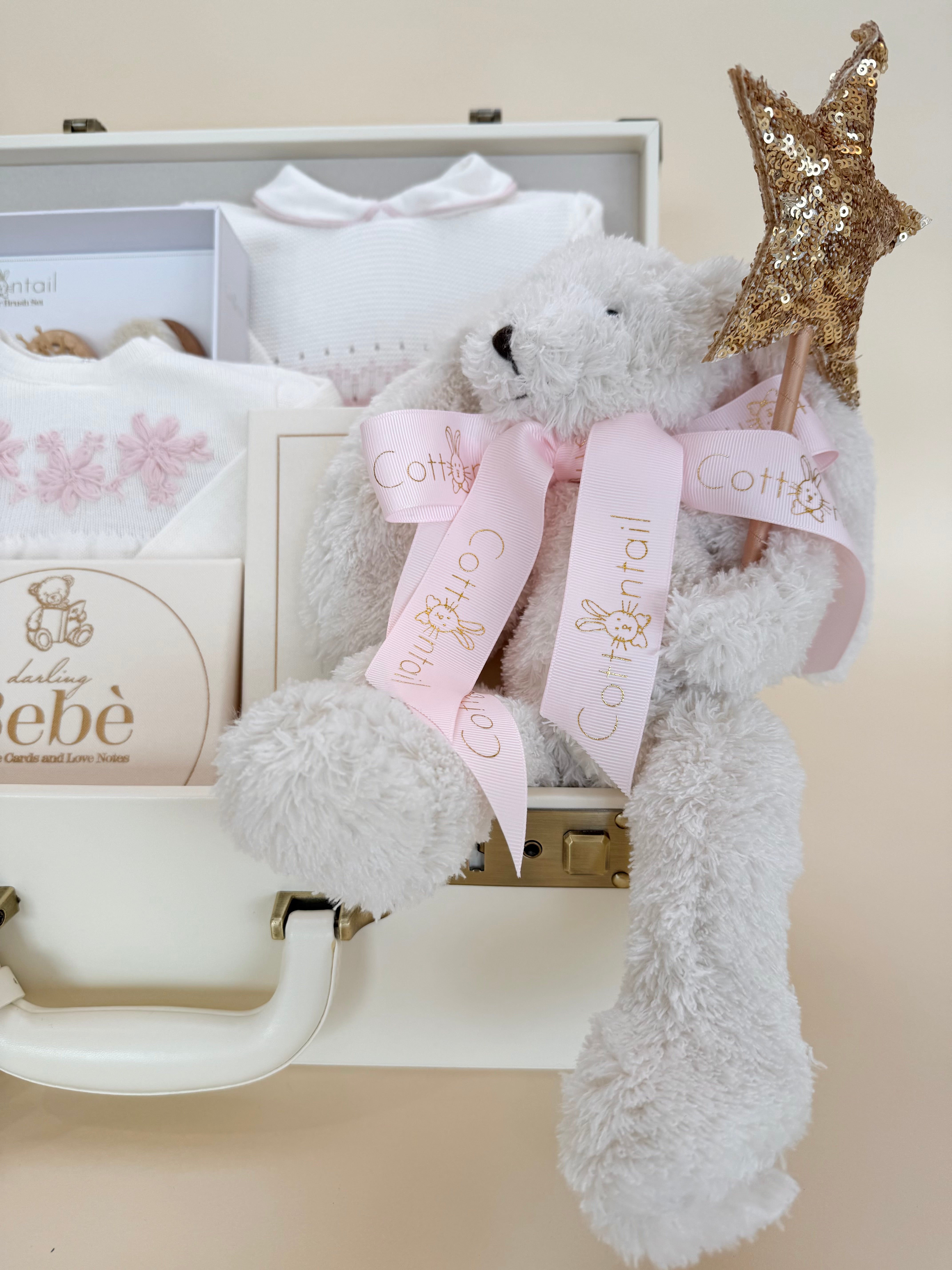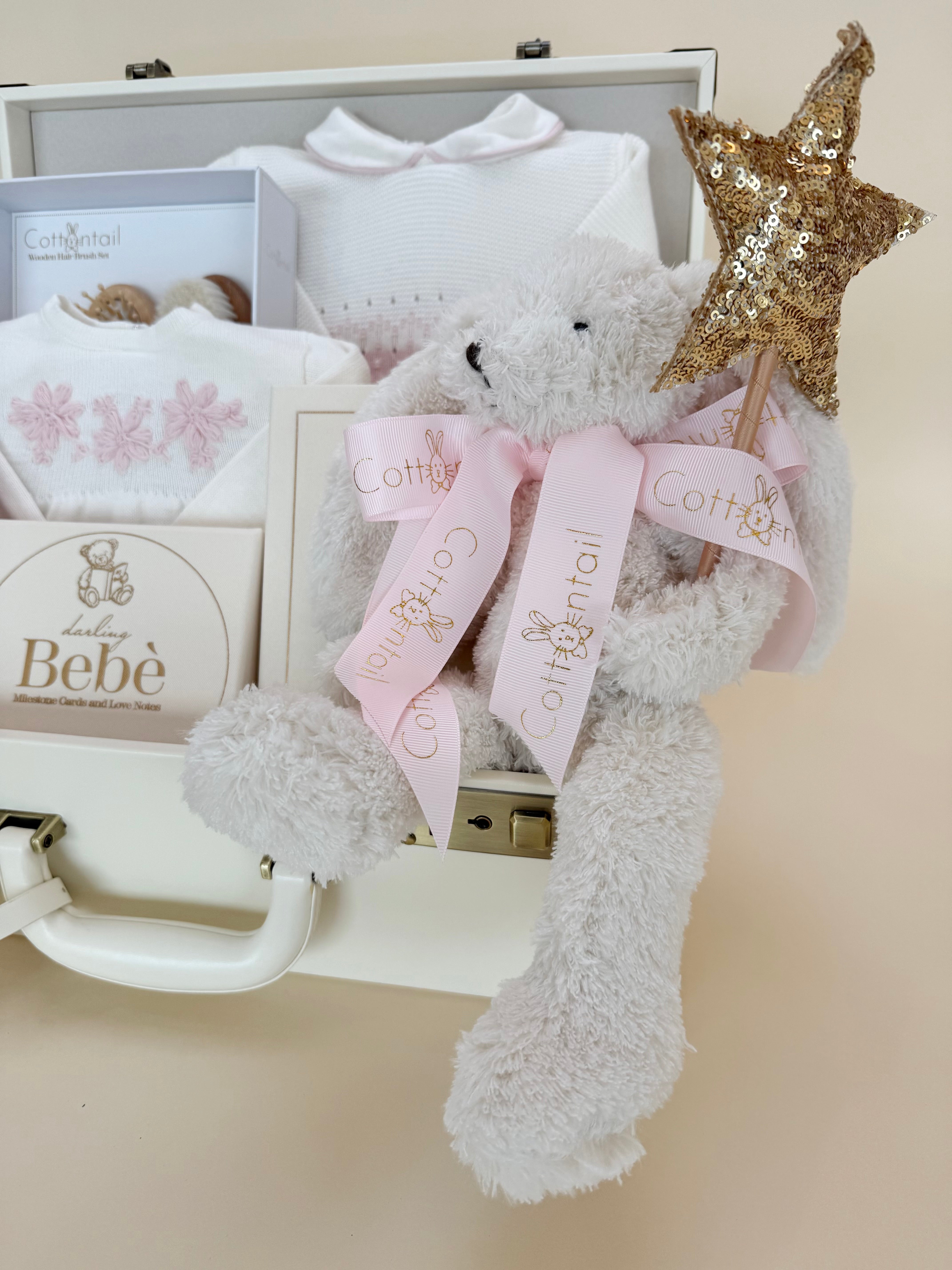 - A cuddly bunny plush tied with a blush ribbon and holding a sparkling star wand—adding a touch of magic and whimsy to the gift