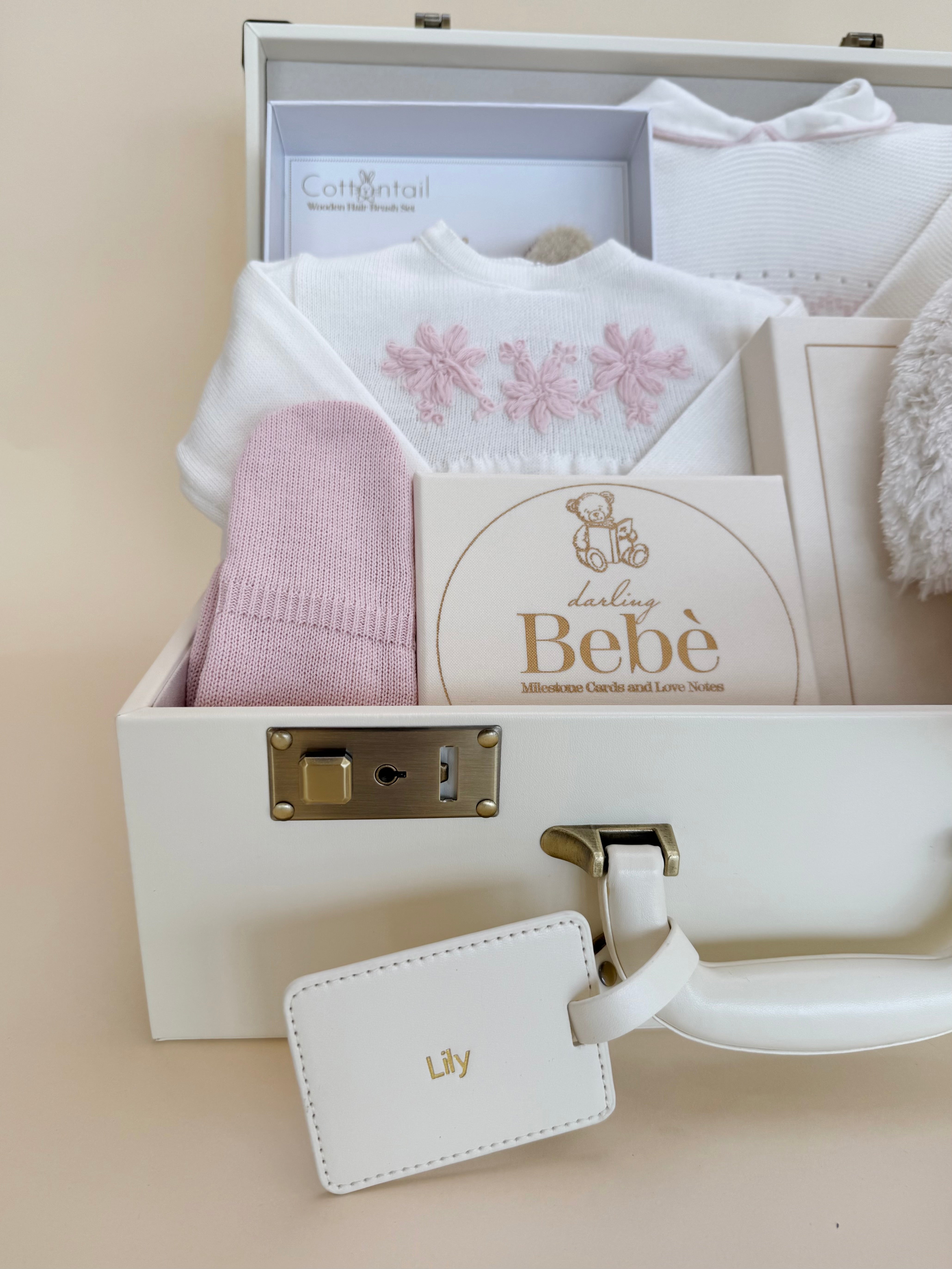 All items are nestled inside a cream suitcase-style keepsake box, perfect for storing baby treasures long after the first days have passed.