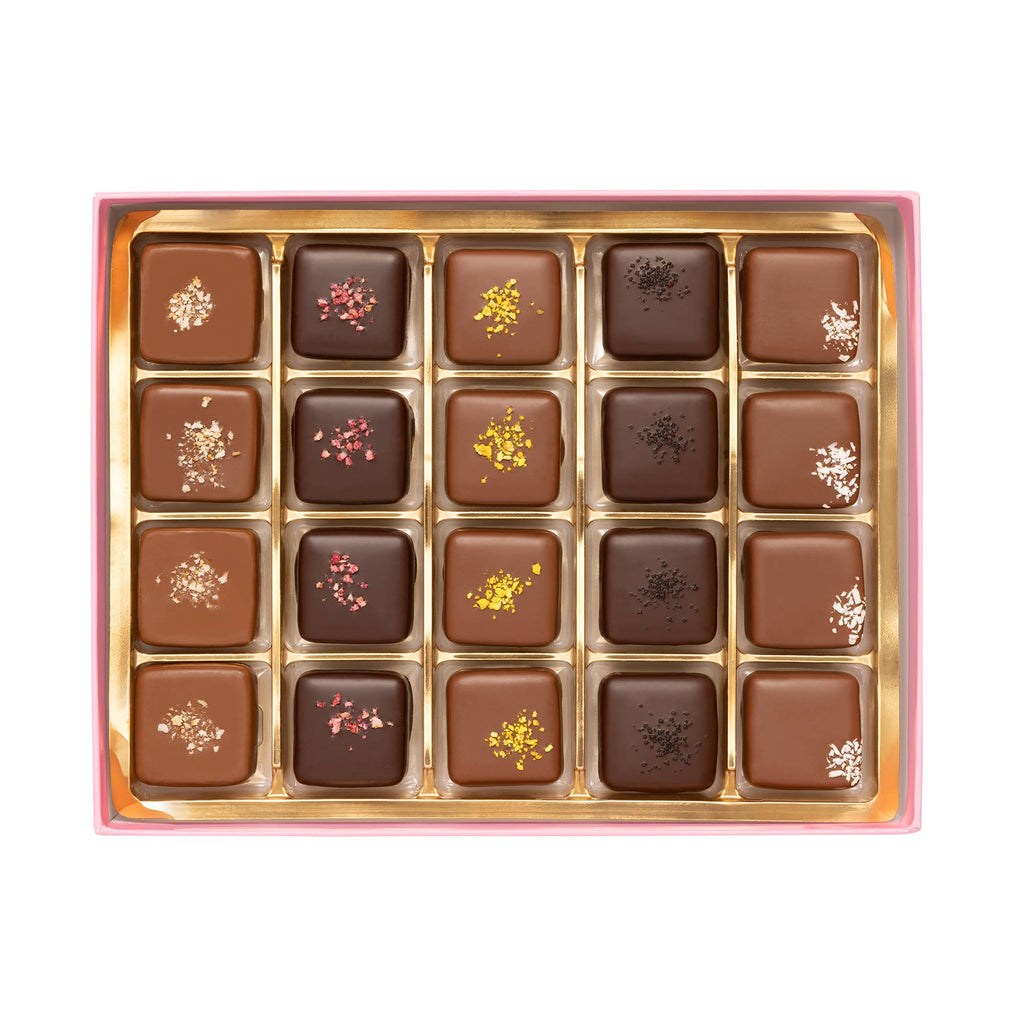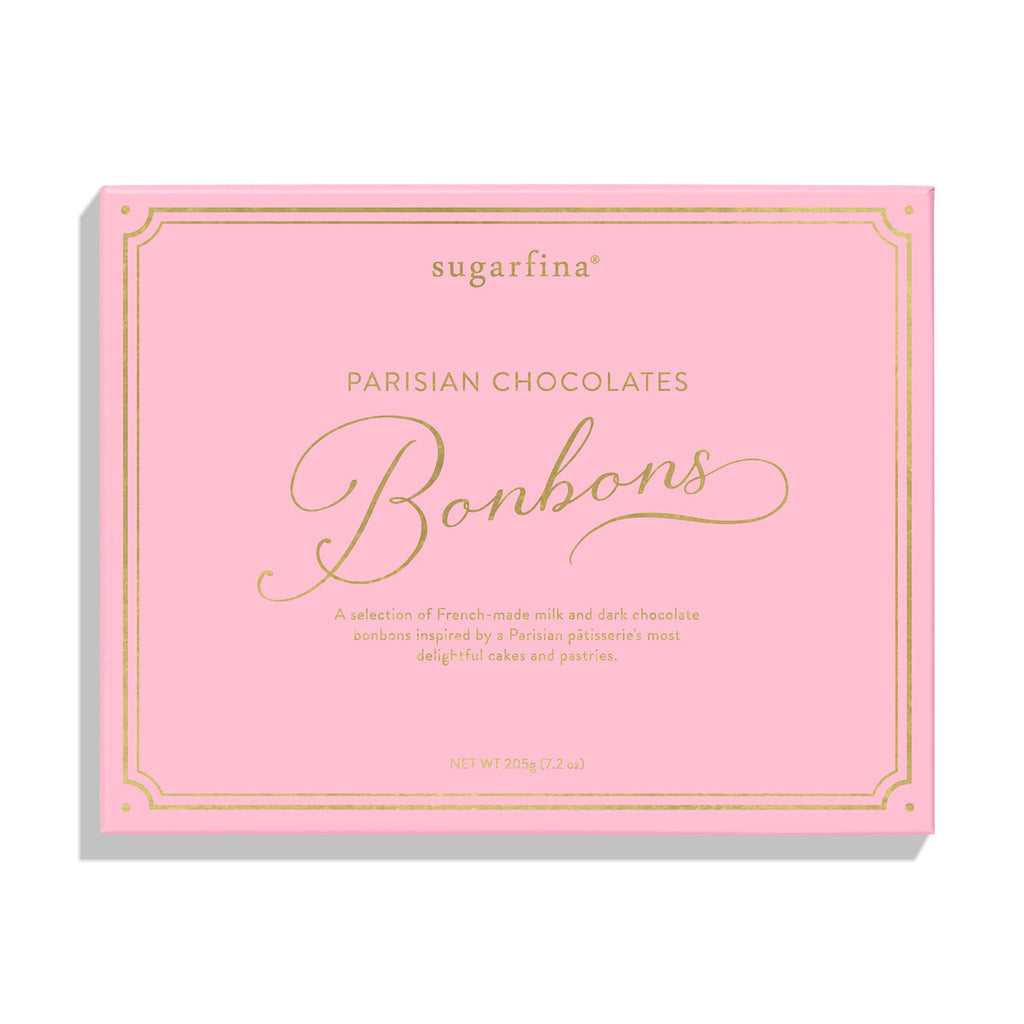 A selection of French-made milk and dark chocolate bonbons inspired by a Parisian pâtisserie's most delightful cakes and pastries.